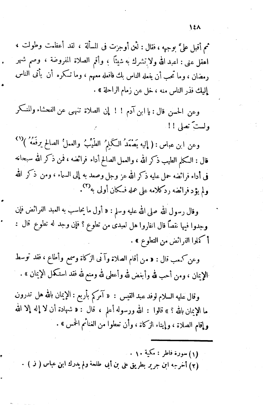 وَعَن ابْن عَبَّاس {إِلَيْهِ يصعد الْكَلم الطّيب وَالْعَمَل الصَّالح يرفعهُ} قَالَ الْكَلم الطّيب ذكر الله وَالْعَمَل الصَّالح أَدَاء فَرَائِضه فَمن ذكر الله سُبْحَانَهُ فِي أَدَاء فَرَائِضه حمل عَلَيْهِ ذكر الله عز وَجل وَصعد بِهِ إِلَى السَّمَاء وَمن ذكر الله وَلم يؤذ فَرَائِضه رد كَلَامه على عمله فَكَانَ أولى بِهِ