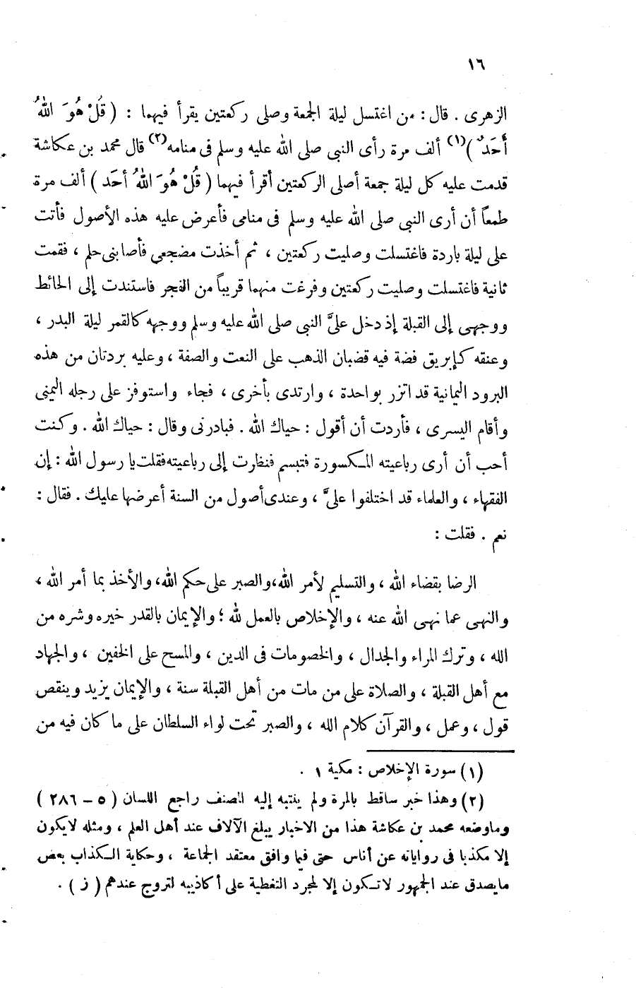 الزُّهْرِيّ قَالَ من اغْتسل لَيْلَة الْجُمُعَة وَصلى رَكْعَتَيْنِ يقْرَأ فيهمَا {قل هُوَ الله أحد} ألف مرّة رأى النَّبِي صلى الله عَلَيْهِ وَسلم فِي مَنَامه قَالَ مُحَمَّد بن عكاشة قدمت عَلَيْهِ كل لَيْلَة جُمُعَة أصلى الرَّكْعَتَيْنِ أَقرَأ فيهمَا {قل هُوَ الله أحد} ألف مرّة طَمَعا أَن ارى النَّبِي صلى الله عَلَيْهِ وَسلم فِي مَنَامِي فَأَعْرض عَلَيْهِ هَذِه الْأُصُول فَأَتَت على لَيْلَة بَارِدَة فاغتسلت وَصليت رَكْعَتَيْنِ ثمَّ اخذت مضجعي فَأَصَابَنِي حلم فَقُمْت ثَانِيَة فاغتسلت وَصليت رَكْعَتَيْنِ وفرغت مِنْهُمَا قَرِيبا من الْفجْر فاستندت إِلَى الْحَائِط ووجهي إِلَى الْقبْلَة إِذْ دخل على النَّبِي صلى الله عَلَيْهِ وَسلم وَوَجهه كَالْقَمَرِ لَيْلَة الْبَدْر وعنقه كإبريق فضَّة فِيهِ قضبان الذَّهَب على النَّعْت وَالصّفة وَعَلِيهِ بردتان من هَذِه البرود اليمانية قد اتزر بِوَاحِدَة وارتدى بِأُخْرَى فجَاء واستوفز على رجله الْيُمْنَى وَأقَام الْيُسْرَى فَأَرَدْت أَن أَقُول حياك الله فبادرني وَقَالَ حياك الله وَكنت أحب أَن أرى رباعيته الْمَكْسُورَة فَتَبَسَّمَ فَنَظَرت إِلَى رباعيته فَقلت يَا رَسُول الله إِن الْفُقَهَاء وَالْعُلَمَاء قد اخْتلفُوا على وَعِنْدِي أصُول من السّنة اعرضها عَلَيْك فَقَالَ نعم فَقلت