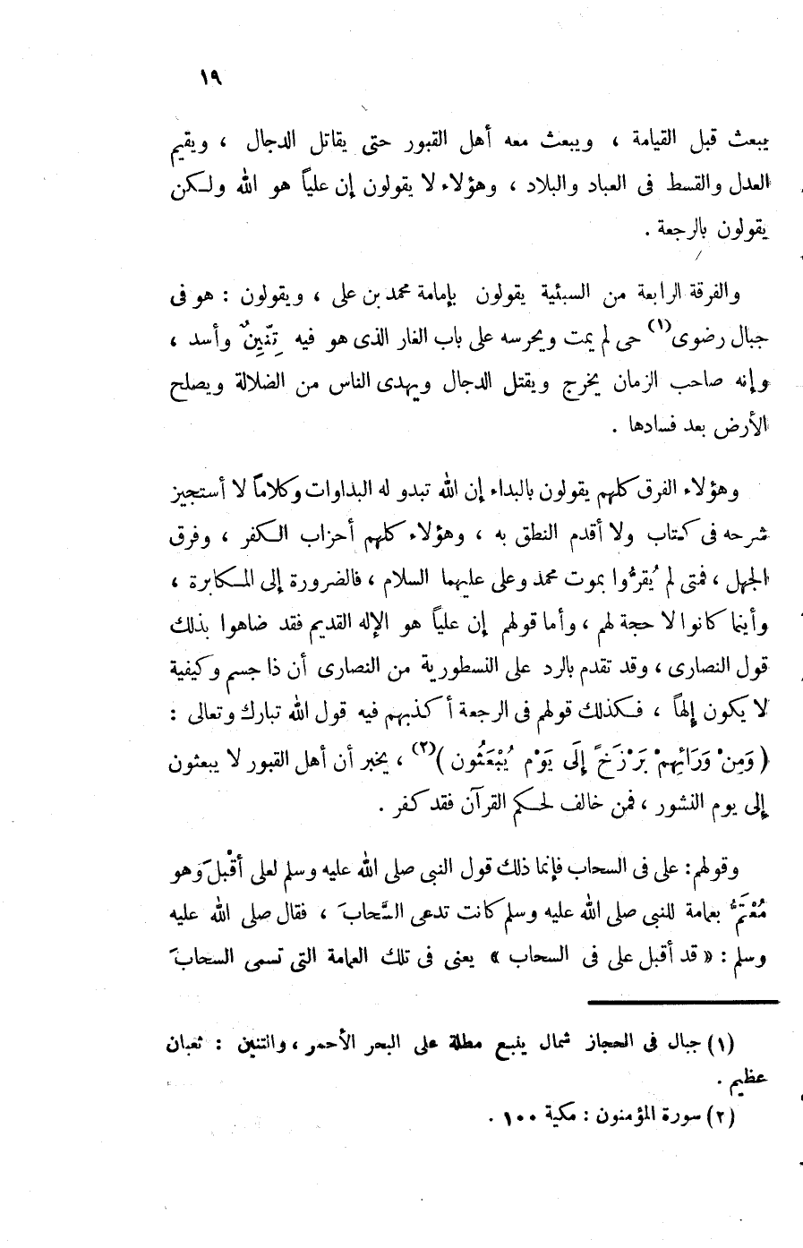 وَهَؤُلَاء الْفرق كلهم يَقُولُونَ بالبداء إِن الله تبدو لَهُ البداوات وكلاما لَا استجيز شَرحه فِي كتاب وَلَا أقدم النُّطْق بِهِ وَهَؤُلَاء كلهم أحزاب الْكفْر وَفرق الْجَهْل فَمَتَى لم يقرُّوا بِمَوْت مُحَمَّد وَعلي عَلَيْهِمَا السَّلَام فالضرورة إِلَى المكابرة وأينما كَانُوا لَا حجَّة لَهُم وَأما قَوْلهم إِن عليا هُوَ الْإِلَه الْقَدِيم فقد ضاهوا بذلك قَول النَّصَارَى وَقد تقدم بِالرَّدِّ على النسطورية من النَّصَارَى أَن ذَا جسم وَكَيْفِيَّة لَا يكون إِلَهًا فَكَذَلِك قَوْلهم فِي الرّجْعَة أكذبهم فِيهِ قَول الله تبَارك وَتَعَالَى {وَمن ورائهم برزخ إِلَى يَوْم يبعثون} يخبر أَن أهل الْقُبُور لَا يبعثون إِلَى يَوْم النشور فَمن خَالف لحكم الْقُرْآن فقد كفر