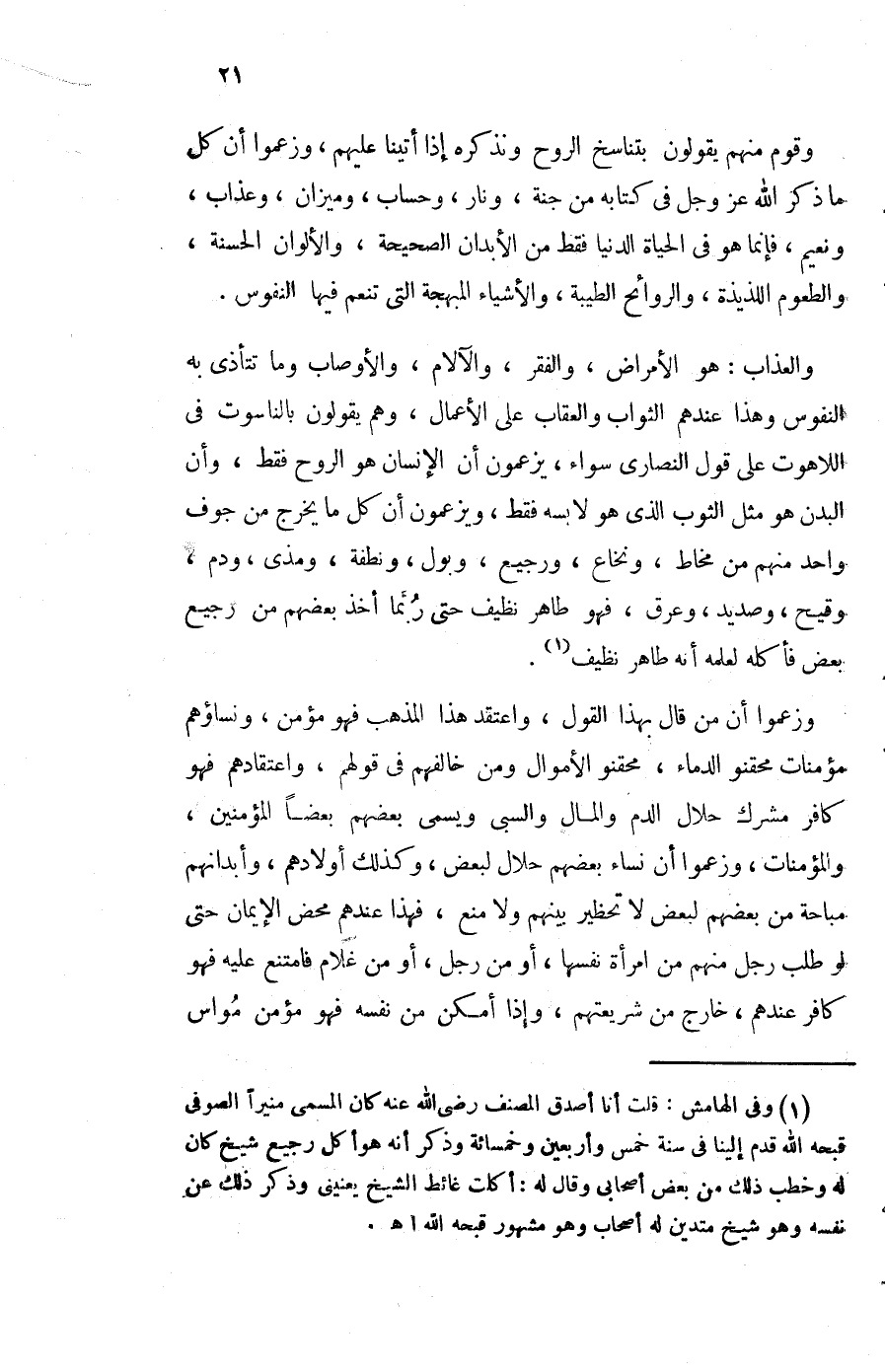 وَقوم مِنْهُم يَقُولُونَ بتناسخ الرّوح ونذكره إِذا أَتَيْنَا عَلَيْهِم وَزَعَمُوا أَن كل مَا ذكر الله عز وَجل فِي كِتَابه من جنَّة ونار وحساب وميزان وَعَذَاب ونعيم فَإِنَّمَا هُوَ فِي الْحَيَاة الدُّنْيَا فَقَط من الْأَبدَان الصَّحِيحَة والألوان الْحَسَنَة والطعوم اللذيذة والروائح الطّيبَة والأشياء المبهجة الَّتِي تنعم فِيهَا النُّفُوس
