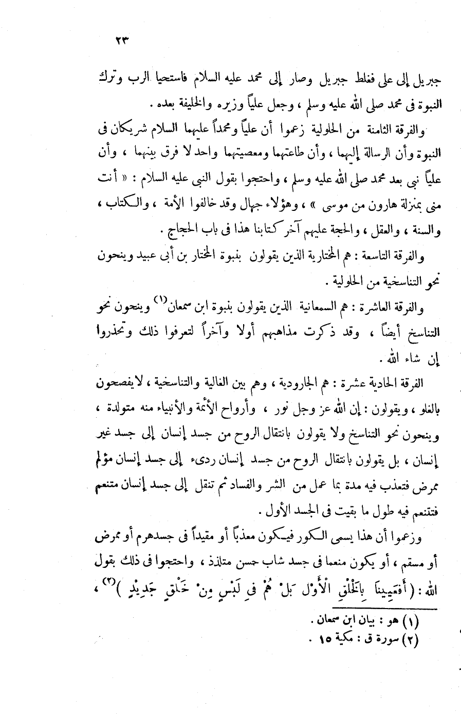 والفرقة الثَّامِنَة من الحلولية زَعَمُوا أَن عليا ومحمدا عَلَيْهِمَا السَّلَام شريكان فِي النُّبُوَّة وَأَن الرسَالَة إِلَيْهِمَا وَأَن طاعتهما ومعصيتهما وَاحِد لَا فرق بَينهمَا وَأَن عليا نَبِي بعد مُحَمَّد صلى الله عَلَيْهِ وَسلم وَاحْتَجُّوا بقول النَّبِي عَلَيْهِ السَّلَام أَنْت منى بِمَنْزِلَة هَارُون من مُوسَى وَهَؤُلَاء جهال وَقد خالفوا الْأمة وَالْكتاب وَالسّنة وَالْعقل وَالْحجّة عَلَيْهِم آخر كتَابنَا هَذَا فِي بَاب الْحجَّاج