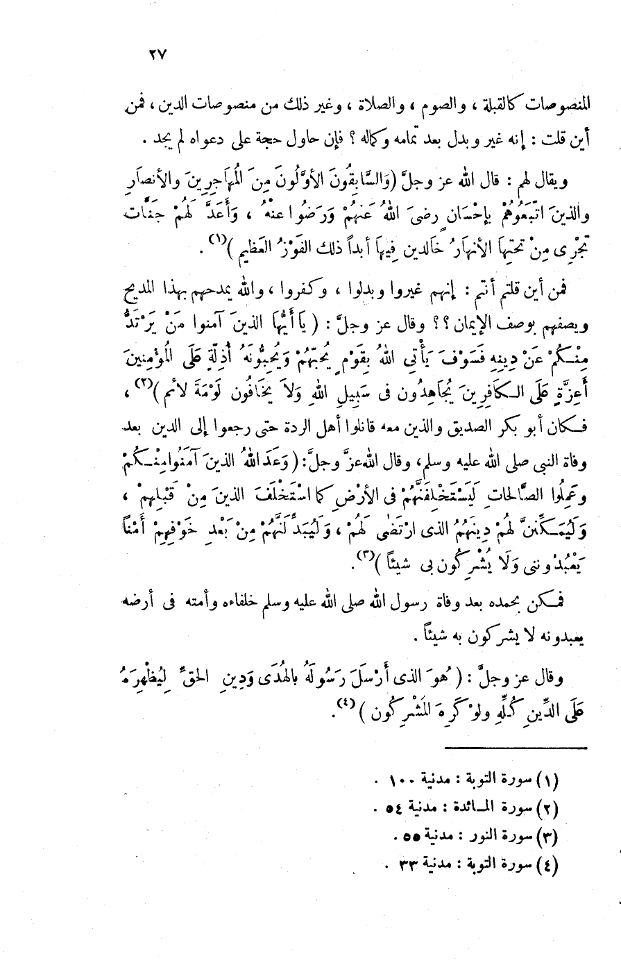 فَمن أَيْن قُلْتُمْ أَنْتُم إِنَّهُم غيروا وبدلوا وَكَفرُوا وَالله يمدحهم بِهَذَا المديح ويصفهم بِوَصْف الْإِيمَان وَقَالَ عز وَجل {يَا أَيهَا الَّذين آمنُوا من يرْتَد مِنْكُم عَن دينه فَسَوف يَأْتِي الله بِقوم يُحِبهُمْ وَيُحِبُّونَهُ أَذِلَّة على الْمُؤمنِينَ أعزة على الْكَافرين يجاهدون فِي سَبِيل الله وَلَا يخَافُونَ لومة لائم} فَكَانَ أَبُو بكر الصّديق وَالَّذين مَعَه قَاتلُوا أهل الرِّدَّة حَتَّى رجعُوا إِلَى الدّين بعد وَفَاة النَّبِي صلى الله عَلَيْهِ وَسلم وَقَالَ الله عز وَجل وعد الله الَّذين آمنُوا مِنْكُم وَعمِلُوا الصَّالِحَات ليَستَخْلِفنهم فِي الأَرْض كَمَا اسْتخْلف الَّذين من قبلهم وليمكنن لَهُم دينهم الَّذِي ارتضى لَهُم وليبدلنهم من بعد خوفهم أمنا يعبدونني وَلَا يشركُونَ بِي شَيْئا