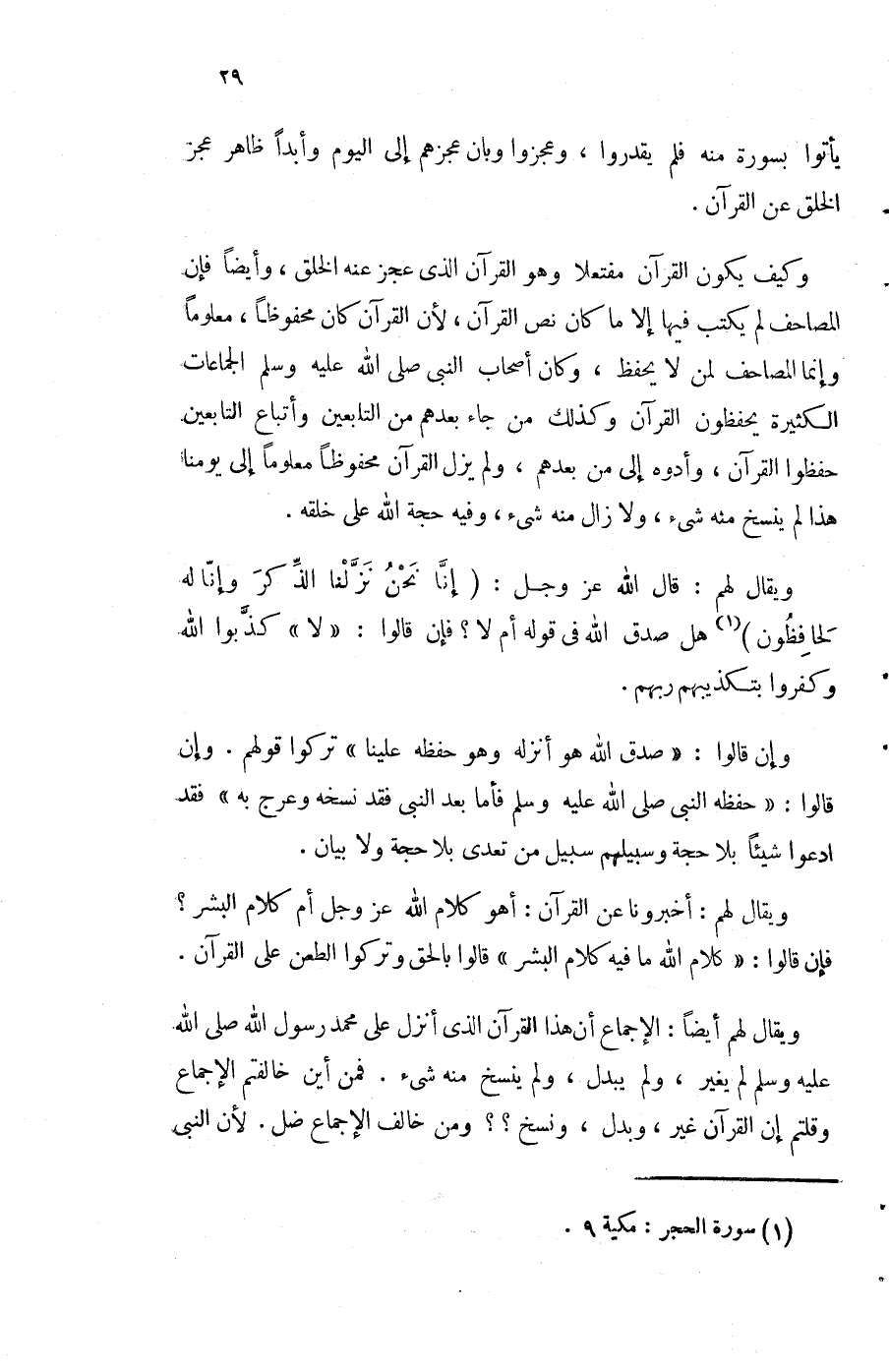وَكَيف يكون الْقُرْآن مفتعلا وَهُوَ الْقُرْآن الَّذِي عجز عَنهُ الْخلق وَأَيْضًا فَإِن الْمَصَاحِف لم يكْتب فِيهَا إِلَّا مَا كَانَ نَص الْقُرْآن لِأَن الْقُرْآن كَانَ مَحْفُوظًا مَعْلُوما وَإِنَّمَا الْمَصَاحِف لمن لَا يحفظ وَكَانَ أَصْحَاب النَّبِي صلى الله عَلَيْهِ وَسلم الْجَمَاعَات الْكَثِيرَة يحفظون الْقُرْآن وَكَذَلِكَ من جَاءَ بعدهمْ من التَّابِعين وَأَتْبَاع التَّابِعين حفظوا الْقُرْآن وأدوه إِلَى من بعدهمْ وَلم يزل الْقُرْآن مَحْفُوظًا مَعْلُوما إِلَى يَوْمنَا هَذَا لم ينْسَخ مِنْهُ شَيْء وَلَا زَالَ مِنْهُ شَيْء وَفِيه حجَّة الله على خلقه
