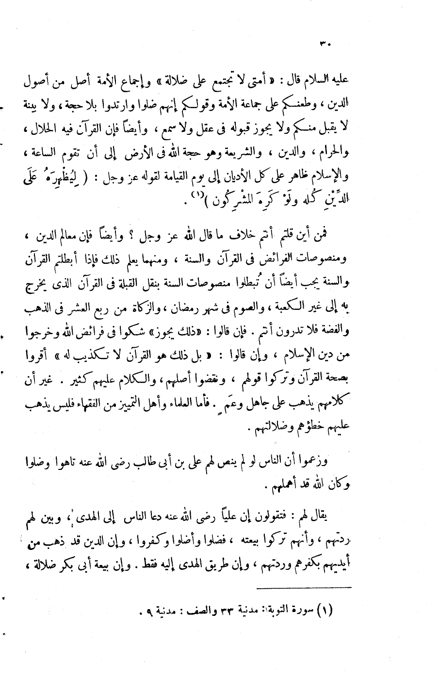 عَلَيْهِ السَّلَام قَالَ أمتِي لَا تَجْتَمِع على ضَلَالَة وَإِجْمَاع الْأمة أصل من أصُول الدّين وطعنكم على جمَاعَة الْأمة وقولكم إِنَّهُم ضلوا وَارْتَدوا بِلَا حجَّة وَلَا بَيِّنَة لَا يقبل مِنْكُم وَلَا يجوز قبُوله فِي عقل وَلَا سمع وَأَيْضًا فَإِن الْقُرْآن فِيهِ الْحَلَال وَالْحرَام وَالدّين والشريعة وَهُوَ حجَّة الله فِي الأَرْض إِلَى أَن تقوم السَّاعَة وَالْإِسْلَام ظَاهر على كل الْأَدْيَان إِلَى يَوْم الْقِيَامَة لقَوْله عز وَجل {لِيظْهرهُ على الدّين كُله وَلَو كره الْمُشْركُونَ}