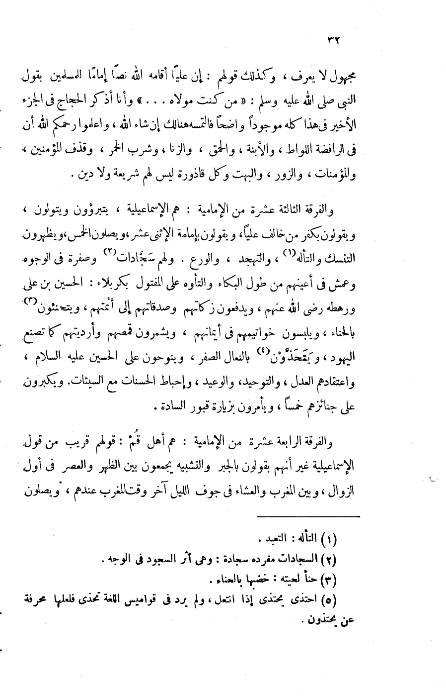 والفرقة الثَّالِثَة عشرَة من الإمامية هم الإسماعيلية يتبرؤون ويتولون وَيَقُولُونَ بِكفْر من خَالف عليا وَيَقُولُونَ بإمامة الإثنى عشر وَيصلونَ الْخمس ويظهرون التنسك والتأله والتجهد والورع وَلَهُم سجادات وصفرة فِي الْوُجُوه وعمش فِي أَعينهم من طول الْبكاء والتأوه على المفتول بكربلاء الْحُسَيْن بن عَليّ ورهطه رَضِي الله عَنْهُم ويدفعون زكاتهم وصدقاتهم إِلَى أئمتهم ويتحنئون بِالْحِنَّاءِ وَيلبسُونَ خواتيمهم فِي أَيْمَانهم ويشمرون قمصهم وأرديتهم كَمَا تصنع الْيَهُود ويتحذون بالنعال الصفر وينوحون على الْحُسَيْن عَلَيْهِ السَّلَام واعتقادهم الْعدْل والتوحيد والوعيد وإحباط الْحَسَنَات مَعَ السَّيِّئَات وَيُكَبِّرُونَ على جنائزهم خمْسا ويأمرون بزيارة قُبُور السَّادة