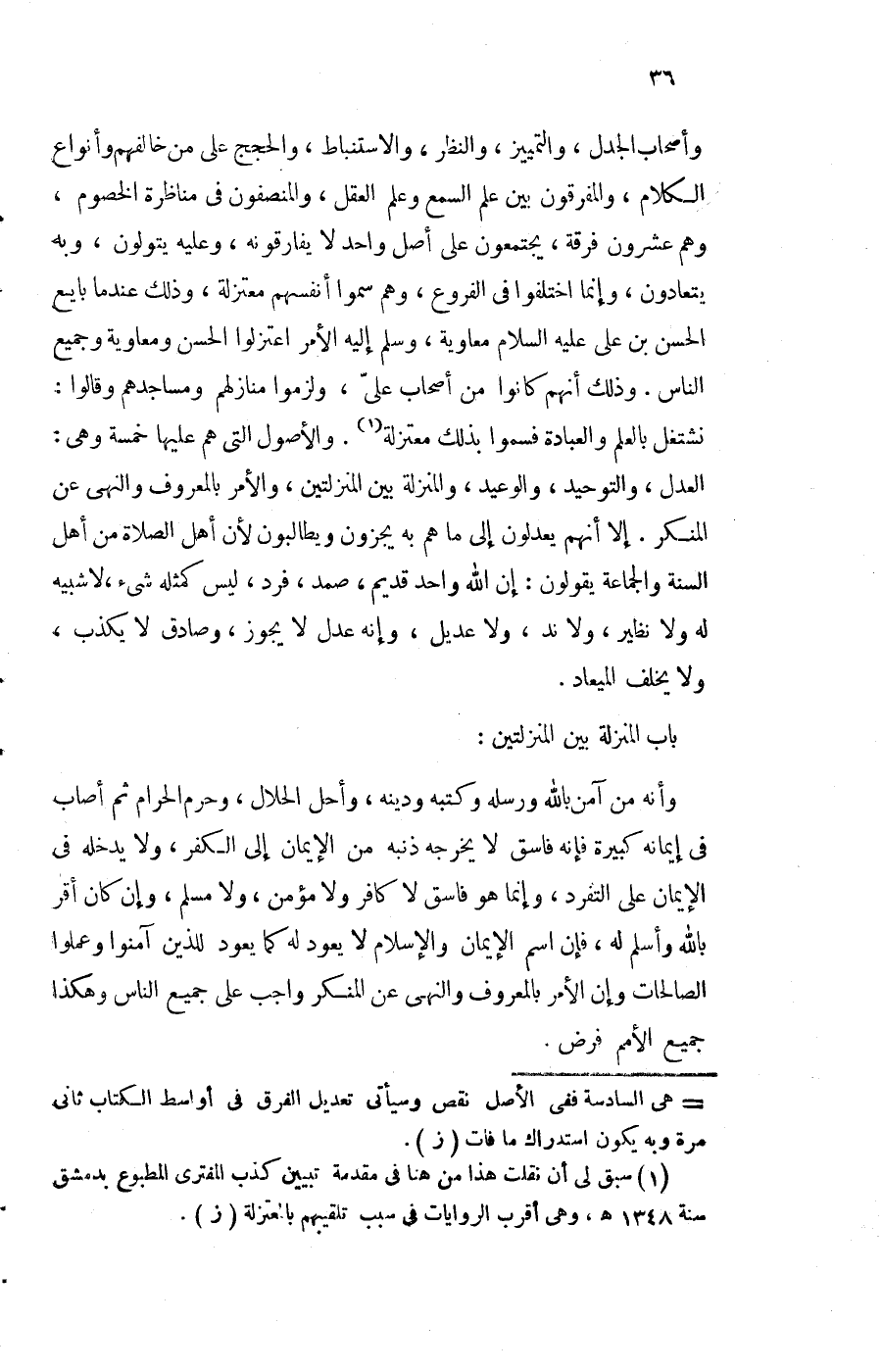 وَأَصْحَاب الجدل والتمييز وَالنَّظَر والاستنباط والحجج على من خالفهم وأنواع الْكَلَام والمفرقون بَين علم السّمع وَعلم الْعقل والمنصفون فِي مناظرة الْخُصُوم وهم عشرُون فرقة يَجْتَمعُونَ على أصل وَاحِد لَا يفارقونه وَعَلِيهِ يتولون وَبِه يتعادون وَإِنَّمَا اخْتلفُوا فِي الْفُرُوع وهم سموا أنفسهم معتزلة وَذَلِكَ عِنْدَمَا بَايع الْحسن بن عَليّ عَلَيْهِ السَّلَام مُعَاوِيَة وَسلم إِلَيْهِ الْأَمر اعتزلوا الْحسن وَمُعَاوِيَة وَجَمِيع النَّاس وَذَلِكَ أَنهم كَانُوا من أَصْحَاب عَليّ ولزموا مَنَازِلهمْ ومساجدهم وَقَالُوا نشتغل بِالْعلمِ وَالْعِبَادَة فسموا بذلك معتزلة وَالْأُصُول الَّتِي هم عَلَيْهَا خَمْسَة وَهِي الْعدْل والتوحيد والوعيد والمنزلة بَين المنزلتين وَالْأَمر بِالْمَعْرُوفِ وَالنَّهْي عَن الْمُنكر إِلَّا أَنهم يعدلُونَ إِلَى مَا هم بِهِ يجزون ويطالبون لِأَن أهل الصَّلَاة من أهل السّنة وَالْجَمَاعَة يَقُولُونَ إِن الله وَاحِد قديم صَمد فَرد لَيْسَ كمثله شَيْء لَا شَبيه لَهُ وَلَا نَظِير وَلَا ند وَلَا عديل وَإنَّهُ عدل لَا يجوز وصادق لَا يكذب وَلَا يخلف الميعاد