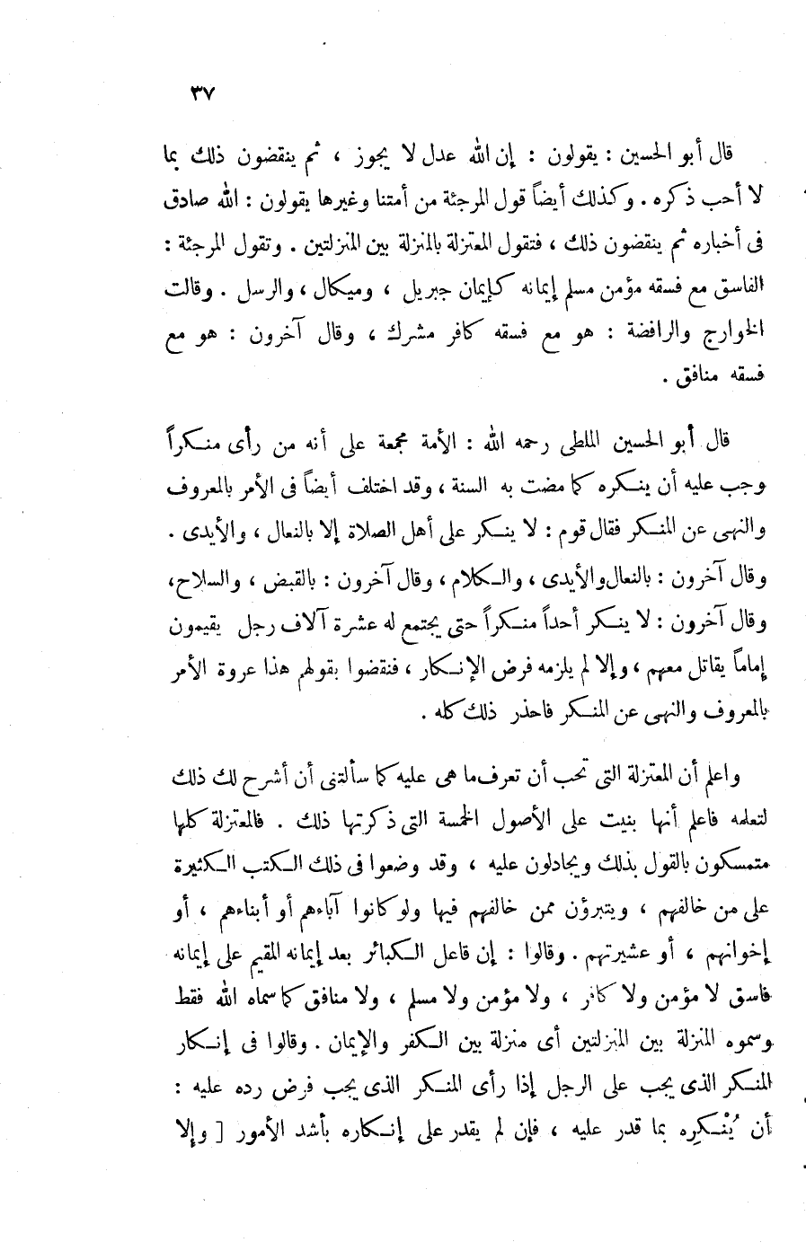 وَاعْلَم أَن الْمُعْتَزلَة الَّتِي تحب أَن تعرف مَا هِيَ عَلَيْهِ كَمَا سَأَلتنِي أَن أشرح لَك ذَلِك لتعلمه فَاعْلَم أَنَّهَا بنيت على الْأُصُول الْخَمْسَة الَّتِي ذكرتها ذَلِك فالمعتزلة كلهَا متمسكون بالْقَوْل بذلك ويجادلون عَلَيْهِ وَقد وضعُوا فِي ذَلِك الْكتب الْكَثِيرَة على من خالفهم ويتبرؤن مِمَّن خالفهم فِيهَا وَلَو كَانُوا آبَاءَهُم أَو أَبْنَاءَهُم أَو إخْوَانهمْ أَو عشيرتهم وَقَالُوا إِن فَاعل الْكَبَائِر بعد إيمَانه الْمُقِيم على إيمَانه فَاسق لَا مُؤمن وَلَا كَافِر وَلَا مُؤمن وَلَا مُسلم وَلَا مُنَافِق كَمَا سَمَّاهُ الله فَقَط وسموه الْمنزلَة بَين المنزلتين أَي منزلَة بَين الْكفْر وَالْإِيمَان وَقَالُوا فِي إِنْكَار الْمُنكر الَّذِي يجب على الرجل إِذا رأى الْمُنكر الَّذِي يجب فرض رده عَلَيْهِ أَن يُنكره بِمَا قدر عَلَيْهِ فَإِن لم يقدر على إِنْكَاره بأشد الْأُمُور وَإِلَّا