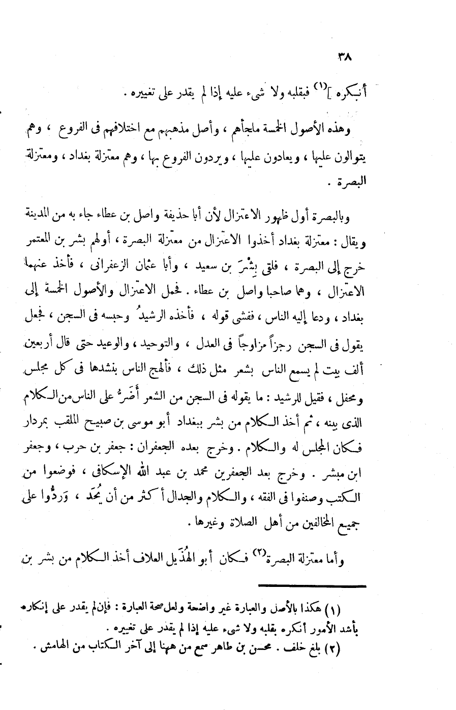 وبالبصرة أول ظُهُور الاعتزال لِأَن أَبَا حُذَيْفَة وَاصل بن عَطاء جَاءَ بِهِ من الْمَدِينَة وَيُقَال معتزلة بَغْدَاد أخذُوا الاعتزال من معتزلة الْبَصْرَة أَو لَهُم بشر بن الْمُعْتَمِر خرج إِلَى الْبَصْرَة فلقى بشر بن سعيد وَأَبا عُثْمَان الزَّعْفَرَانِي فَأخذ عَنْهُمَا الاعتزال وهما صاحبا وَاصل بن عَطاء فَحمل الاعتزال وَالْأُصُول الْخَمْسَة إِلَى بَغْدَاد ودعا إِلَيْهِ النَّاس ففشى قَوْله فَأَخذه الرشيد وحبسه فِي السجْن فَجعل يَقُول فِي السجْن رجزا مزاوجا فِي الْعدْل والتوحيد والوعيد حَتَّى قَالَ أَرْبَعِينَ ألف بَيت لم يسمع النَّاس بِشعر مثل ذَلِك فألهج النَّاس بنشدها فِي كل مجْلِس ومحفل فَقيل الرشيد مَا يَقُوله فِي السجْن من الشّعْر أضرّ على النَّاس من الْكَلَام الَّذِي بَينه ثمَّ أَخذ الْكَلَام من بشر بِبَغْدَاد أَبُو مُوسَى بن صبيح الملقب بمردار فَكَانَ الْمجْلس لَهُ وَالْكَلَام وَخرج بعده الجعفران جَعْفَر بن حَرْب وجعفر ابْن مُبشر وَخرج بعد الجعفرين مُحَمَّد بن عبد الله الإسكافي فوضعوا من الْكتب وصنفوا فِي الْفِقْه وَالْكَلَام والجدال أَكثر من ان يحد وردوا على جَمِيع الْمُخَالفين من أهل الصَّلَاة وَغَيرهَا