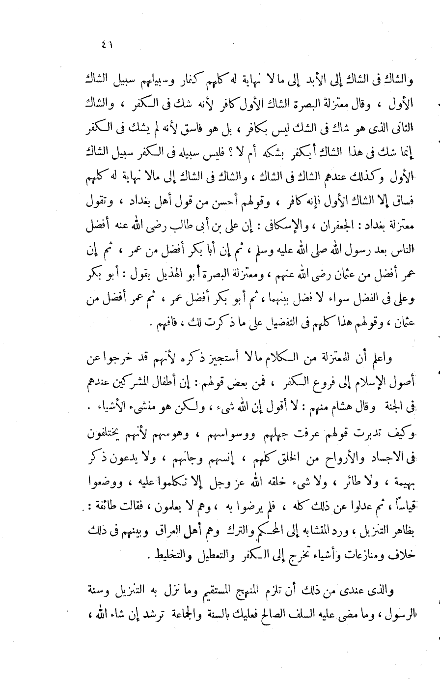 والشاك فِي الشاك إِلَى الْأَبَد إِلَى مَا لَا نِهَايَة لَهُ كلهم كفار وسبيلهم سَبِيل الشاك الأول وَقَالَ معتزلة الْبَصْرَة الشاك الأول كَافِر لِأَنَّهُ شكّ فِي الْكفْر والشاك الثَّانِي الَّذِي هُوَ شَاك فِي الشَّك لَيْسَ بِكَافِر بل هُوَ فَاسق لِأَنَّهُ لم يشك فِي الْكفْر إِنَّمَا شكّ فِي هَذَا الشاك أيكفر بشكه أم لَا فَلَيْسَ سَبيله فِي الْكفْر سَبِيل الشاك الأول وَكَذَلِكَ عِنْدهم الشاك فِي الشاك والشاك فِي الشاك إِلَى مَا لَا نِهَايَة لَهُ كلهم فساق إِلَّا الشاك الأول فَإِنَّهُ كَافِر وَقَوْلهمْ أحسن من قَول أهل بَغْدَاد وَتقول معتزلة بَغْدَاد الجعفران والإسكافي إِن عَليّ بن أبي طَالب رَضِي الله عَنهُ أفضل النَّاس بعد رَسُول الله صلى الله عَلَيْهِ وَسلم ثمَّ إِن ابا بكر أفضل من عمر ثمَّ إِن عمر أفضل من عُثْمَان رَضِي الله عَنْهُم ومعتزلة الْبَصْرَة أَبُو الْهُذيْل يَقُول أَبُو بكر وَعلي فِي الْفضل سَوَاء لَا فضل بَينهمَا ثمَّ ابو بكر أفضل عمر ثمَّ عمر أفضل من عُثْمَان وَقَوْلهمْ هَذَا كلهم فِي التَّفْضِيل على مَا ذكرت لَك فَافْهَم