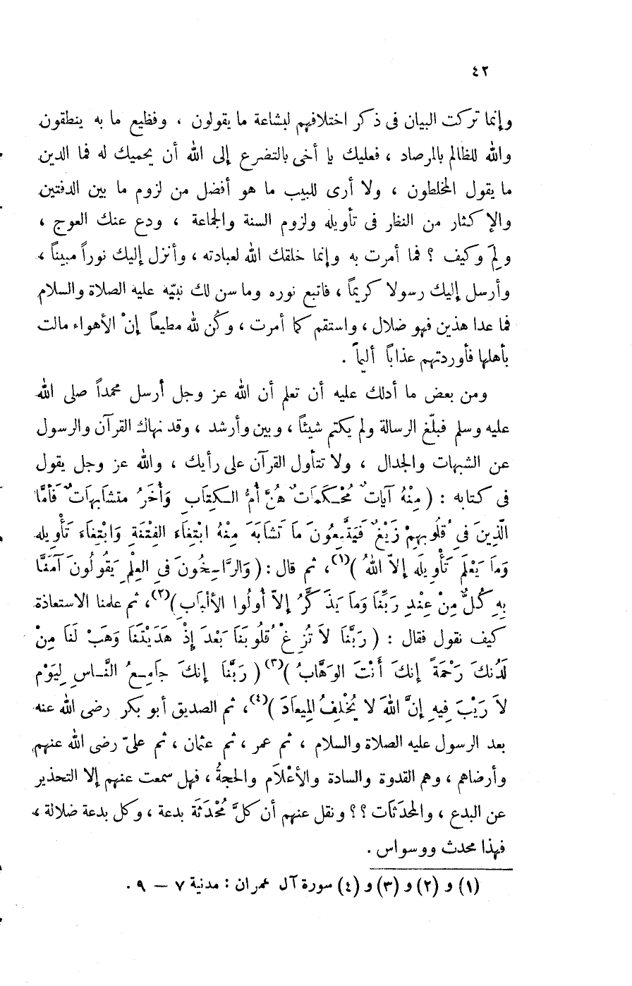 وَمن بعض مَا أدلك عَلَيْهِ أَن تعلم أَن الله عز وَجل أرسل مُحَمَّدًا صلى الله عَلَيْهِ وَسلم فَبلغ الرسَالَة وَلم يكتم شَيْئا وَبَين وأرشد وَقد نهاك الْقُرْآن وَالرَّسُول عَن الشُّبُهَات والجدال وَلَا تتأول الْقُرْآن على رَأْيك وَالله عز وَجل يَقُول فِي كِتَابه {مِنْهُ آيَات محكمات هن أم الْكتاب وَأخر متشابهات فَأَما الَّذين فِي قُلُوبهم زيغ فيتبعون مَا تشابه مِنْهُ ابْتِغَاء الْفِتْنَة وابتغاء تَأْوِيله وَمَا يعلم تَأْوِيله إِلَّا الله} ثمَّ قَالَ {والراسخون فِي الْعلم يَقُولُونَ آمنا بِهِ كل من عِنْد رَبنَا وَمَا يذكر إِلَّا أولُوا الْأَلْبَاب} ثمَّ علمنَا الِاسْتِعَاذَة كَيفَ يَقُول فَقَالَ {رَبنَا لَا تزغ قُلُوبنَا بعد إِذْ هديتنا وهب لنا من لَدُنْك رَحْمَة إِنَّك أَنْت الْوَهَّاب} {رَبنَا إِنَّك جَامع النَّاس ليَوْم لَا ريب فِيهِ إِن الله لَا يخلف الميعاد} ثمَّ الصّديق أَبُو بكر رَضِي الله عَنهُ بعد الرَّسُول عَلَيْهِ الصَّلَاة وَالسَّلَام ثمَّ عمر ثمَّ عُثْمَان ثمَّ عَليّ رَضِي الله عَنْهُم وأرضاهم وهم الْقدْوَة والسادة والأعلام وَالْحجّة فَهَل سَمِعت عَنْهُم إِلَّا التحذير عَن الْبدع والمحدثات وَنقل عَنْهُم أَن كل محدثة بِدعَة وكل بِدعَة ضَلَالَة فَهَذَا مُحدث ووسواس