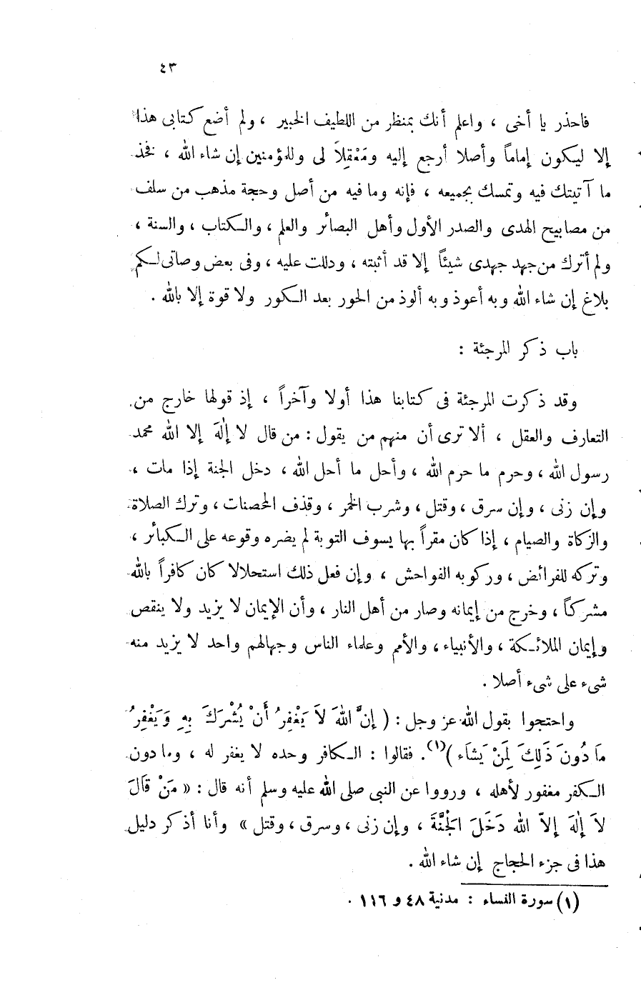 وَقد ذكرت المرجئة فِي كتَابنَا هَذَا أَولا وآخرا إِذْ قَوْلهَا خَارج من التعارف وَالْعقل أَلا ترى أَن مِنْهُم من يَقُول من قَالَ لَا إِلَه إِلَّا الله مُحَمَّد رَسُول الله وَحرم مَا حرم الله وَأحل مَا أحل الله دخل الْجنَّة إِذا مَاتَ وَإِن زنى وَإِن سرق وَقتل وَشرب الْخمر وَقذف الْمُحْصنَات وَترك الصَّلَاة وَالزَّكَاة وَالصِّيَام إِذا كَانَ مقرا بهَا يسوف التَّوْبَة لم يضرّهُ وُقُوعه على الْكَبَائِر وَتَركه للفرائض وركوبه الْفَوَاحِش وَإِن فعل ذَلِك استحلالا كَانَ كَافِرًا بِاللَّه مُشْركًا وَخرج من إيمَانه وَصَارَ من أهل النَّار وَأَن الْإِيمَان لَا يزِيد وَلَا ينقص وإيمان الْمَلَائِكَة والأنبياء والأمم وعلماء النَّاس وجهالهم وَاحِد لَا يزِيد مِنْهُ شَيْء على شَيْء أصلا