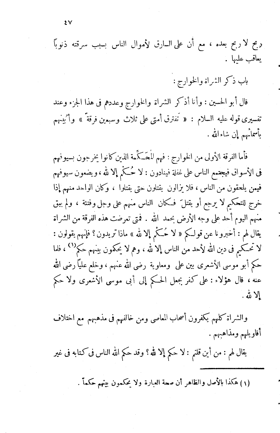 قَالَ أَبُو الْحُسَيْن وَأَنا اذكر الشراة والخوارج وعددهم فِي هَذَا الْجُزْء وَعند تفسيري قَوْله عَلَيْهِ السَّلَام تفترق أمتِي على ثَلَاث وَسبعين فرقة وأبينهم باسمائهم إِن شَاءَ الله