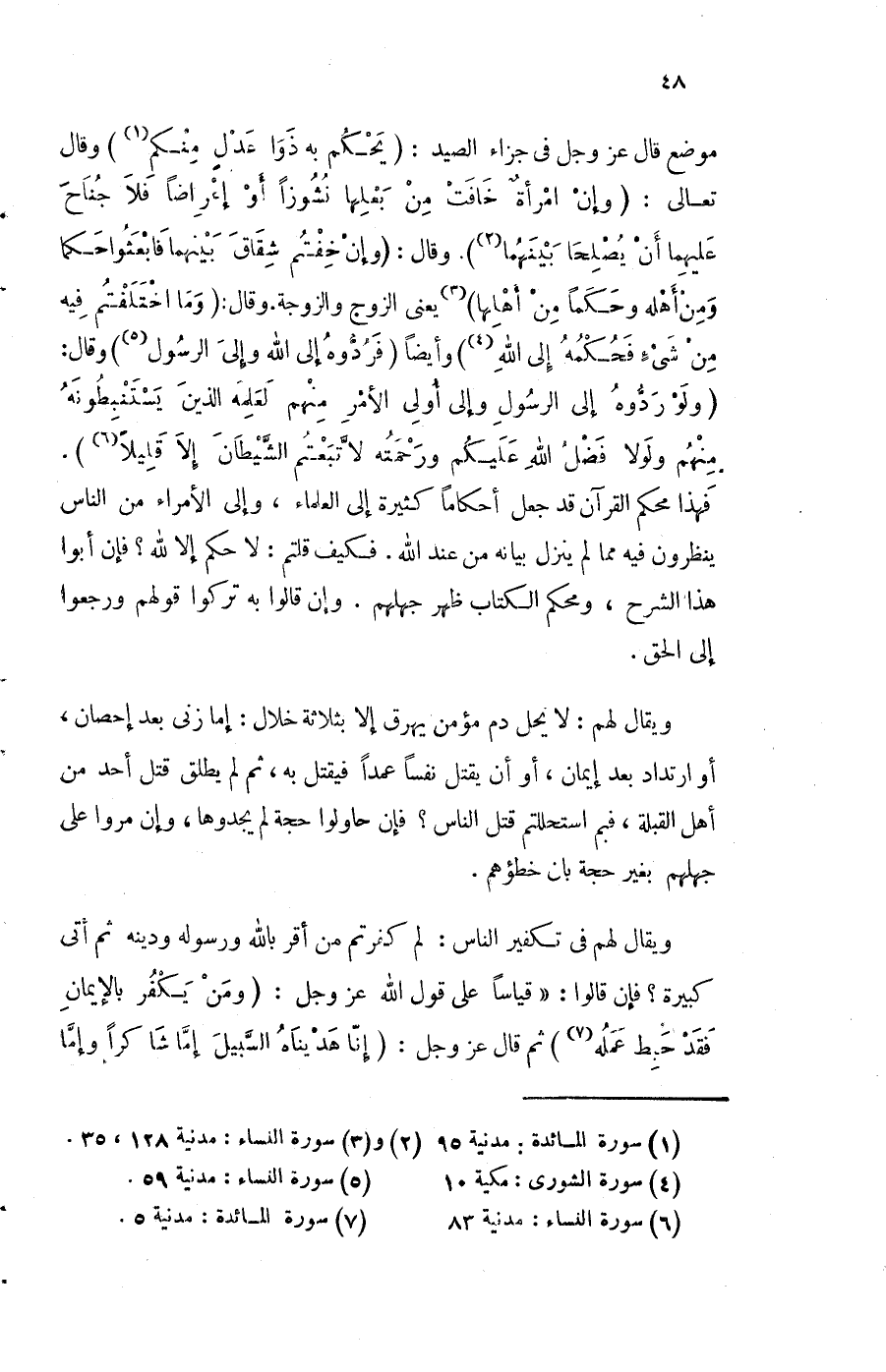 مَوضِع قَالَ عز وَجل فِي جَزَاء الصَّيْد {يحكم بِهِ ذَوا عدل مِنْكُم} وَقَالَ تَعَالَى وَإِن امْرَأَة خَافت من بَعْلهَا نُشُوزًا أَو إعرضا فَلَا جنَاح عَلَيْهِمَا أَن يصلحا بَينهمَا وَقَالَ (وَإِن خِفْتُمْ شقَاق بَينهمَا فَابْعَثُوا حكما وَمن أَهله وَحكما من أَهلهَا) يَعْنِي الزَّوْج وَالزَّوْجَة وَقَالَ وَمَا اختلفتم فِيهِ من شَيْء فَحكمه إِلَى الله وَأَيْضًا فَردُّوهُ إِلَى الله وَإِلَى الرَّسُول وَقَالَ وَلَو ردُّوهُ إِلَى الرَّسُول وَإِلَى أولى الْأَمر مِنْهُم لعلمه الَّذين يستنبطونه مِنْهُم وَلَوْلَا فضل الله عَلَيْكُم وَرَحمته لَا تبعتم الشَّيْطَان إِلَّا قَلِيلا فَهَذَا مُحكم الْقُرْآن قد جعل أحكاما كَثِيرَة إِلَى الْعلمَاء وَإِلَى الْأُمَرَاء من النَّاس ينظرُونَ فِيهِ مِمَّا لم ينزل بَيَانه من عِنْد الله فَكيف قُلْتُمْ لَا حكم إِلَّا لله فَإِن أَبَوا هَذَا الشَّرْح ومحكم الْكتاب ظهر جهلهم وَإِن قَالُوا بِهِ تركُوا قَوْلهم وَرَجَعُوا إِلَى الْحق