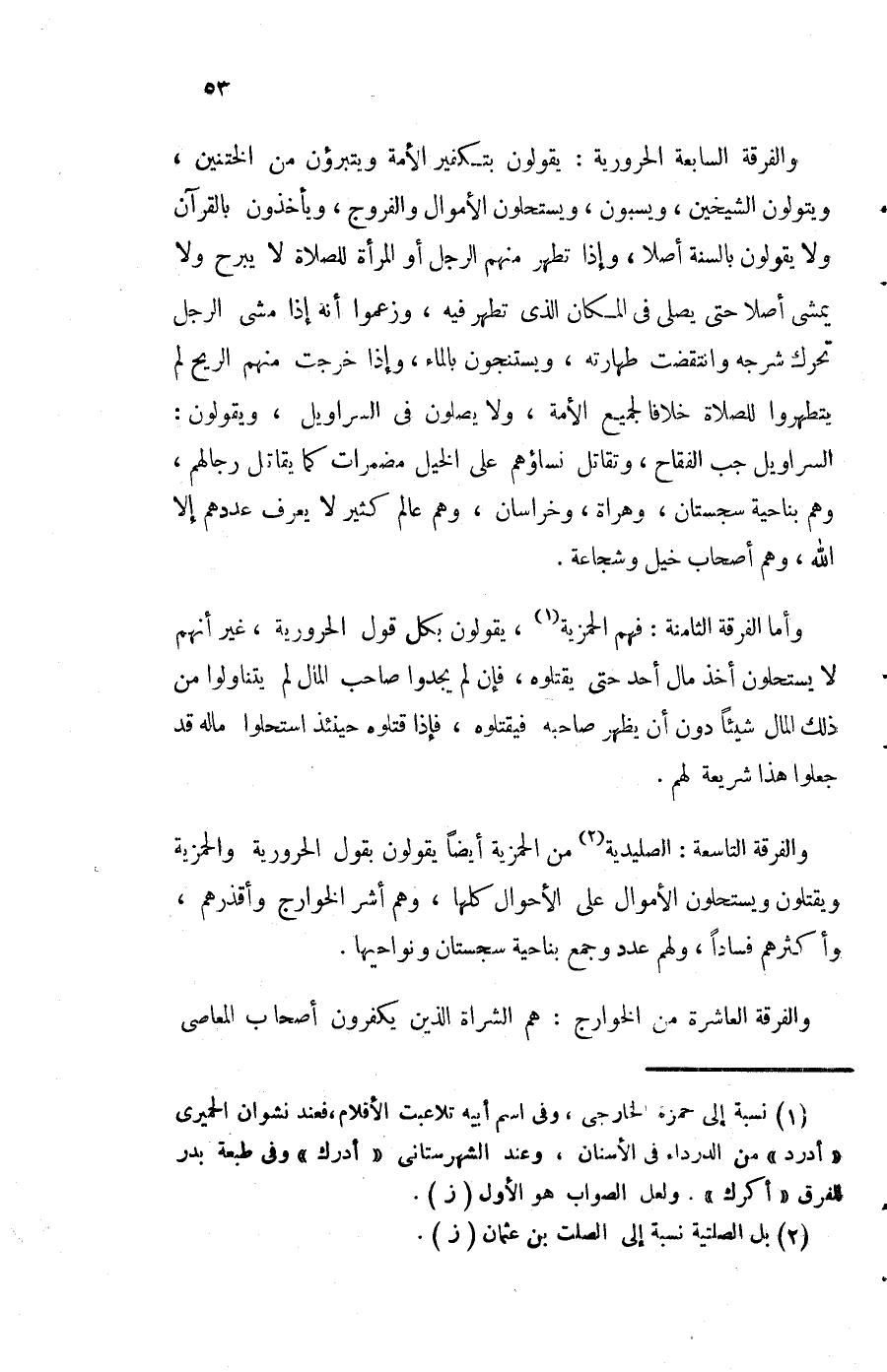 والفرقة السَّابِعَة الحرورية يَقُولُونَ بتكفير الْأمة ويتبرؤن من الختنين ويتولون الشَّيْخَيْنِ ويسبون ويستحلون الْأَمْوَال والفروج وَيَأْخُذُونَ بِالْقُرْآنِ وَلَا يَقُولُونَ بِالسنةِ أصلا وَإِذا تطهر مِنْهُم الرجل أَو الْمَرْأَة للصَّلَاة لَا يبرح وَلَا يمشى أصلا حَتَّى يصلى فِي الْمَكَان الَّذِي تطهر فِيهِ وَزَعَمُوا أَنه إِذا مَشى الرجل تحرّك شرجه وانتقضت طَهَارَته ويستنجون بِالْمَاءِ وَإِذا خرجت مِنْهُم الرّيح لم يَتَطَهَّرُوا للصَّلَاة خلافًا لجَمِيع الْأمة وَلَا يصلونَ فِي السَّرَاوِيل وَيَقُولُونَ السَّرَاوِيل جب الفقاح وتقاتل نِسَاؤُهُم على الْخَيل مضمرات كَمَا يُقَاتل رِجَالهمْ وهم بِنَاحِيَة سجستان وهراة وخراسان وهم عَالم كثير لَا يعرف عَددهمْ إِلَّا الله وهم أَصْحَاب خيل وشجاعة