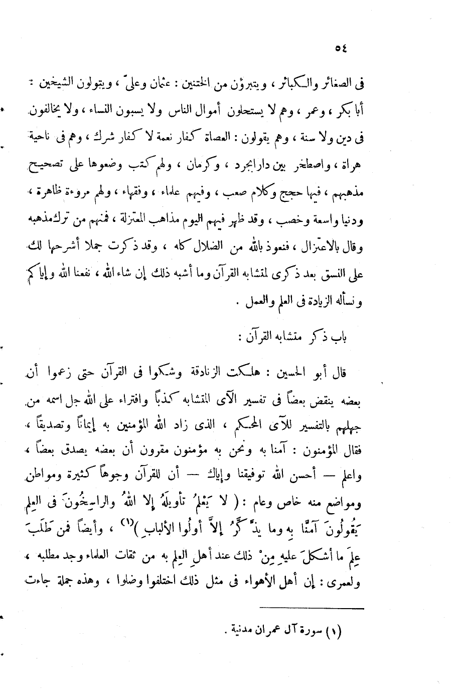 قَالَ أَبُو الْحُسَيْن هَلَكت الزَّنَادِقَة وَشَكوا فِي الْقُرْآن حَتَّى زَعَمُوا أَن بعضه ينْقض بَعْضًا فِي تَفْسِير الآى الْمُتَشَابه كذبا وافتراء على الله جلّ اسْمه من جهلهم بالتفسير للآى الْمُحكم الَّذِي زَاد الله الْمُؤمنِينَ بِهِ إِيمَانًا وَتَصْدِيقًا فَقَالَ الْمُؤْمِنُونَ آمنا بِهِ وَنحن بِهِ مُؤمنُونَ مقرون أَن بعضه يصدق بَعْضًا وَاعْلَم أحسن الله توفيقنا وَإِيَّاك أَن لِلْقُرْآنِ وُجُوهًا كَثِيرَة ومواطن ومواضع مِنْهُ خَاص وعام لَا يعلم تَأْوِيله إِلَّا الله والراسخون فِي الْعلم يَقُولُونَ أمنا بِهِ وَمَا يذكر إِلَّا أولُوا الْأَلْبَاب وَأَيْضًا فَمن طلب علم مَا أشكل عَلَيْهِ من ذَلِك عِنْد أهل الْعلم بِهِ من ثِقَات الْعلمَاء وجد مطلبه ولعمرى إِن أهل الْأَهْوَاء فِي مثل ذَلِك اخْتلفُوا وَضَلُّوا وَهَذِه جملَة جَاءَت