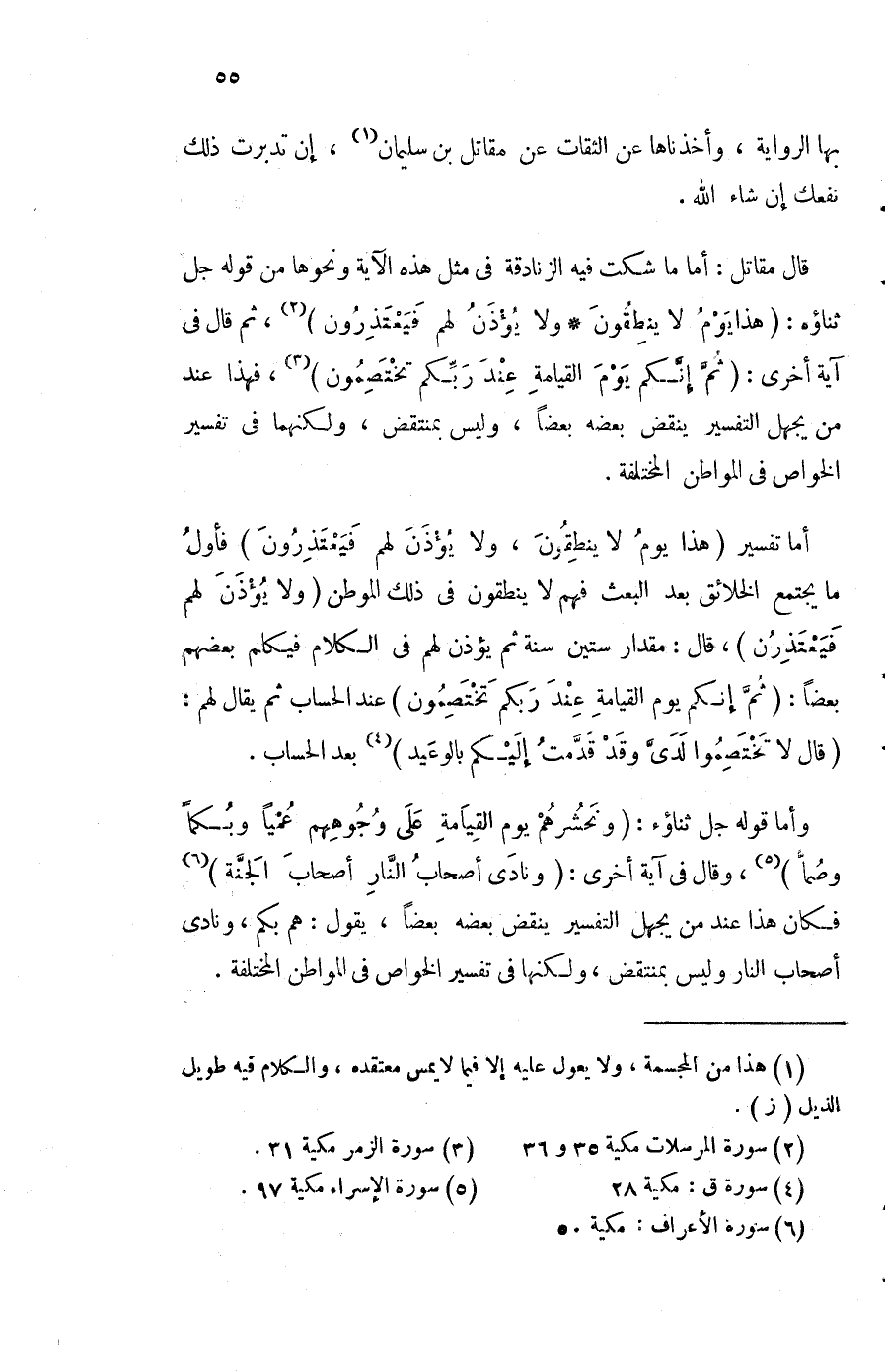 قَالَ مقَاتل أما مَا شكت فِيهِ الزَّنَادِقَة فِي مثل هَذِه الْآيَة وَنَحْوهَا من قَوْله جلّ ثَنَاؤُهُ {هَذَا يَوْم لَا ينطقون وَلَا يُؤذن لَهُم فيعتذرون} ثمَّ قَالَ فِي آيَة أُخْرَى {ثمَّ إِنَّكُم يَوْم الْقِيَامَة عِنْد ربكُم تختصمون} فَهَذَا عِنْد من يجهل التَّفْسِير ينْقض بعضه بَعْضًا وَلَيْسَ بمنتقض ولكنهما فِي تَفْسِير الْخَواص فِي المواطن الْمُخْتَلفَة