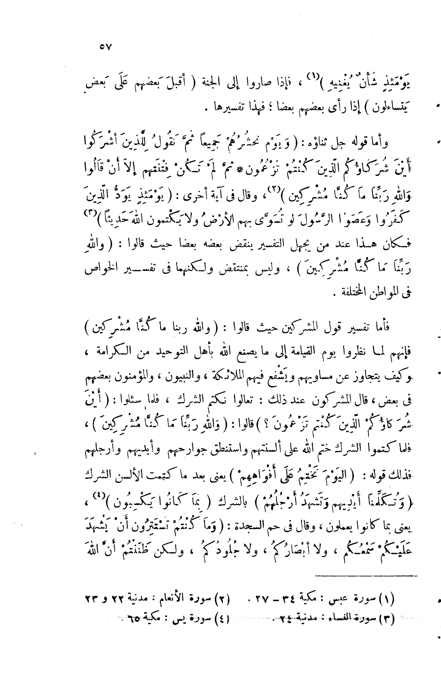 وَأما قَوْله جلّ ثَنَاؤُهُ {وَيَوْم نحشرهم جَمِيعًا ثمَّ نقُول للَّذين أشركوا أَيْن شركاؤكم الَّذين كُنْتُم تَزْعُمُونَ ثمَّ لم تكن فتنتهم إِلَّا أَن قَالُوا وَالله رَبنَا مَا كُنَّا مُشْرِكين} وَقَالَ فِي آيَة أُخْرَى {يَوْمئِذٍ يود الَّذين كفرُوا وعصوا الرَّسُول لَو تسوى بهم الأَرْض وَلَا يكتمون الله حَدِيثا} فَكَانَ هَذَا عِنْد من يجهل التَّفْسِير ينْقض بعضه بَعْضًا حَيْثُ قَالُوا {وَالله رَبنَا مَا كُنَّا مُشْرِكين} وَلَيْسَ بمنتقض ولكنهما فِي تَفْسِير الْخَواص فِي المواطن الْمُخْتَلفَة