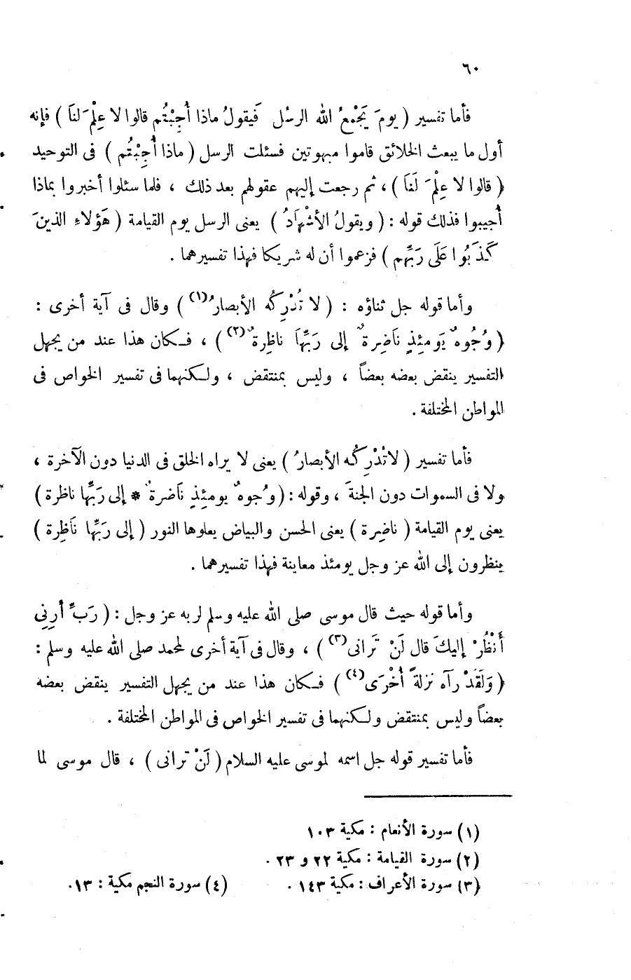 وَأما قَوْله حَيْثُ قَالَ مُوسَى صلى الله عَلَيْهِ وَسلم لرَبه عز وَجل {رب أَرِنِي أنظر إِلَيْك قَالَ لن تراني} وَقَالَ فِي آيَة أُخْرَى لمُحَمد صلى الله عَلَيْهِ وَسلم {وَلَقَد رَآهُ نزلة أُخْرَى} فَكَانَ هَذَا عِنْد من يجهل التَّفْسِير ينْقض بعضه بَعْضًا وَلَيْسَ بمنتقض ولكنهما فِي تَفْسِير الْخَواص فِي المواطن الْمُخْتَلفَة