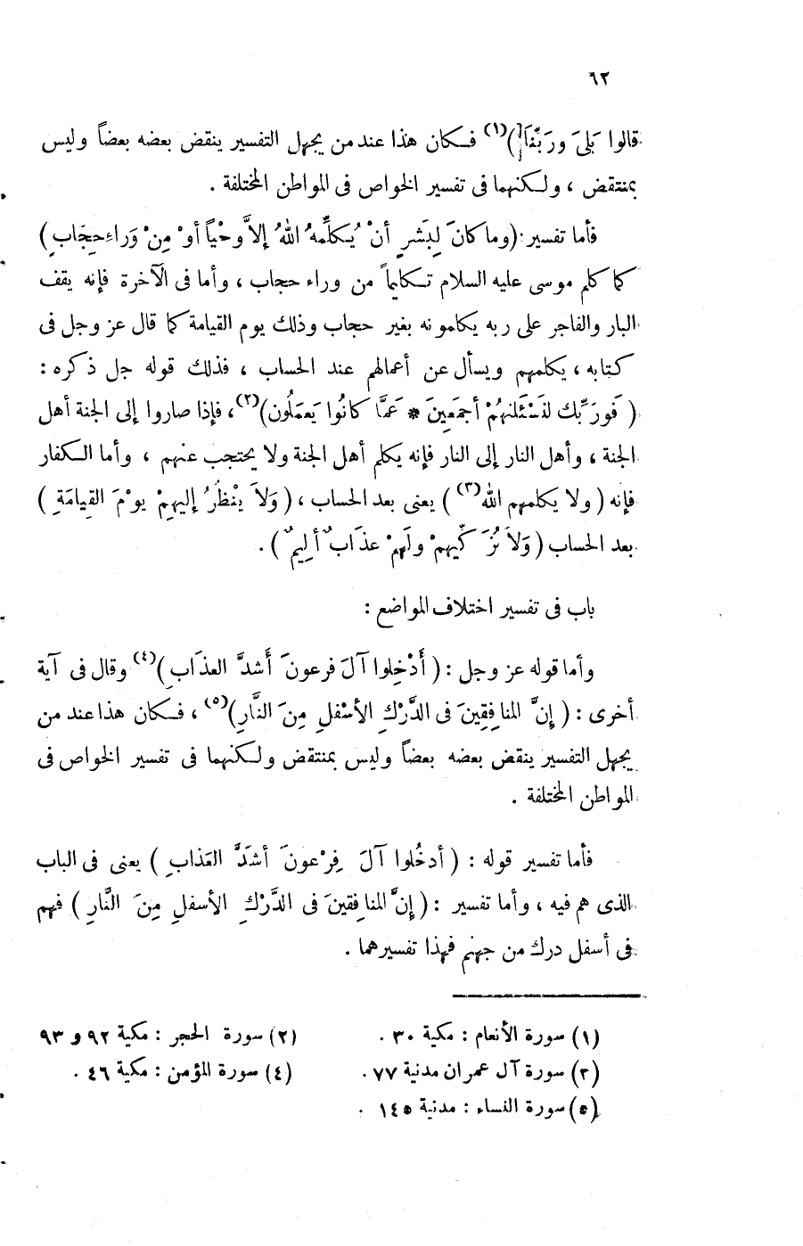 فَأَما تَفْسِير {وَمَا كَانَ لبشر أَن يكلمهُ الله إِلَّا وَحيا أَو من وَرَاء حجاب} كَمَا كلم مُوسَى عَلَيْهِ السَّلَام تكليما من وَرَاء حجاب وَأما فِي الْآخِرَة فَإِنَّهُ يقف الْبَار والفاجر على ربه يكلمونه بِغَيْر حجاب وَذَلِكَ يَوْم الْقِيَامَة كَمَا قَالَ عز وَجل فِي كِتَابه يكلمهم وَيسْأل عَن أَعْمَالهم عِنْد الْحساب فَذَلِك قَوْله جلّ ذكره فوربك لنسئلنهم أَجْمَعِينَ عَمَّا كَانُوا يعْملُونَ فَإِذا صَارُوا إِلَى الْجنَّة أهل الْجنَّة وَأهل النَّار فَإِنَّهُ يكلم أهل الْجنَّة وَلَا يحتجب عَنْهُم وَأما الْكفَّار فَإِنَّهُ {وَلَا يكلمهم الله} يَعْنِي بعد الْحساب {وَلَا ينظر إِلَيْهِم يَوْم الْقِيَامَة} بعد الْحساب {وَلَا يزكيهم وَلَهُم عَذَاب أَلِيم}