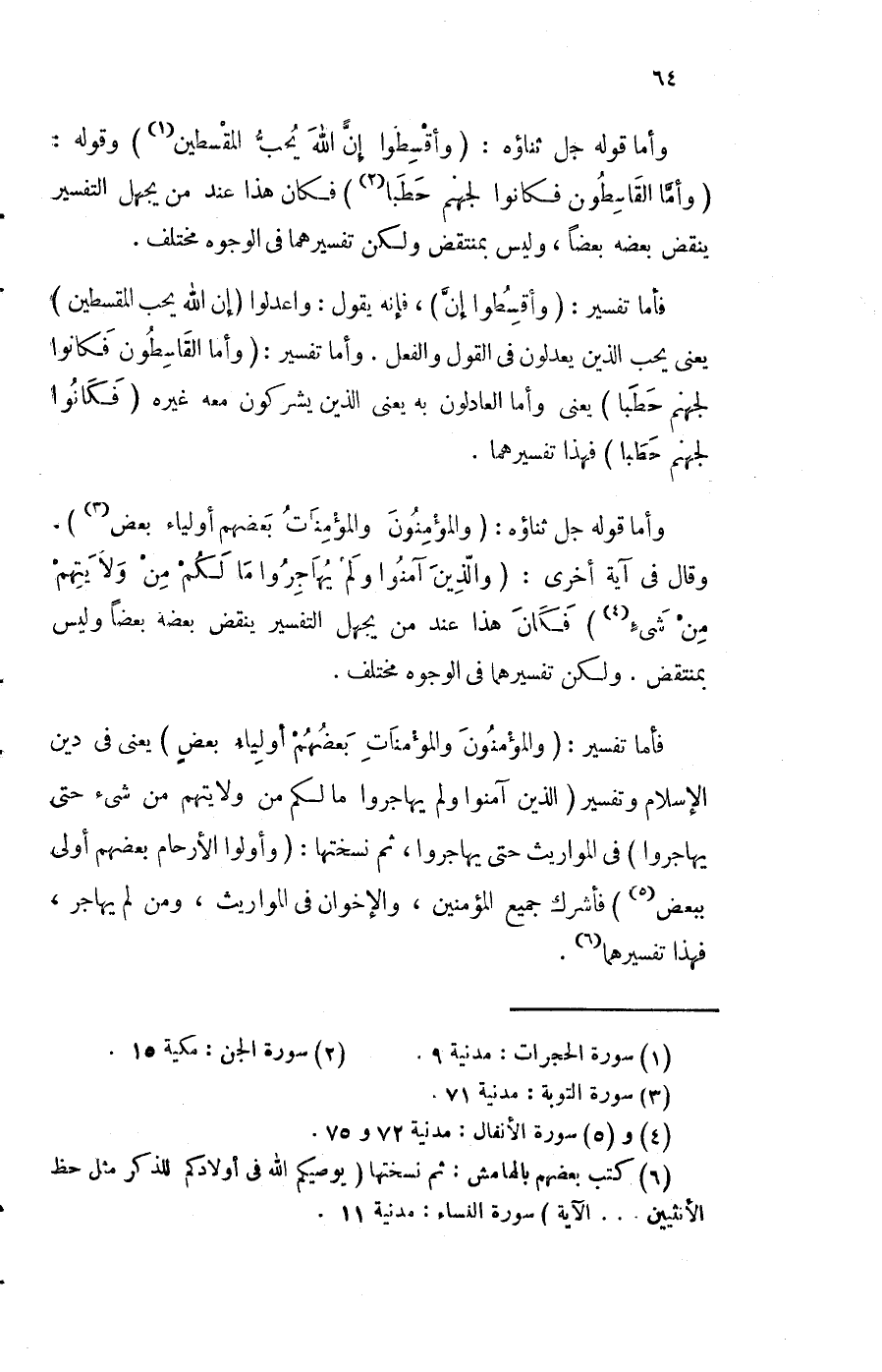 وَأما قَوْله جلّ ثَنَاؤُهُ {والمؤمنون وَالْمُؤْمِنَات بَعضهم أَوْلِيَاء بعض} وَقَالَ فِي آيَة أُخْرَى وَالَّذين آمنُوا وَلم يهاجروا مَا لكم من وَلَا يتهم من شَيْء فَكَانَ هَذَا عِنْد من يجهل التَّفْسِير ينْقض بعضه بَعْضًا وَلَيْسَ بمنتقض وَلَكِن تفسيرهما فِي الْوُجُوه مُخْتَلف