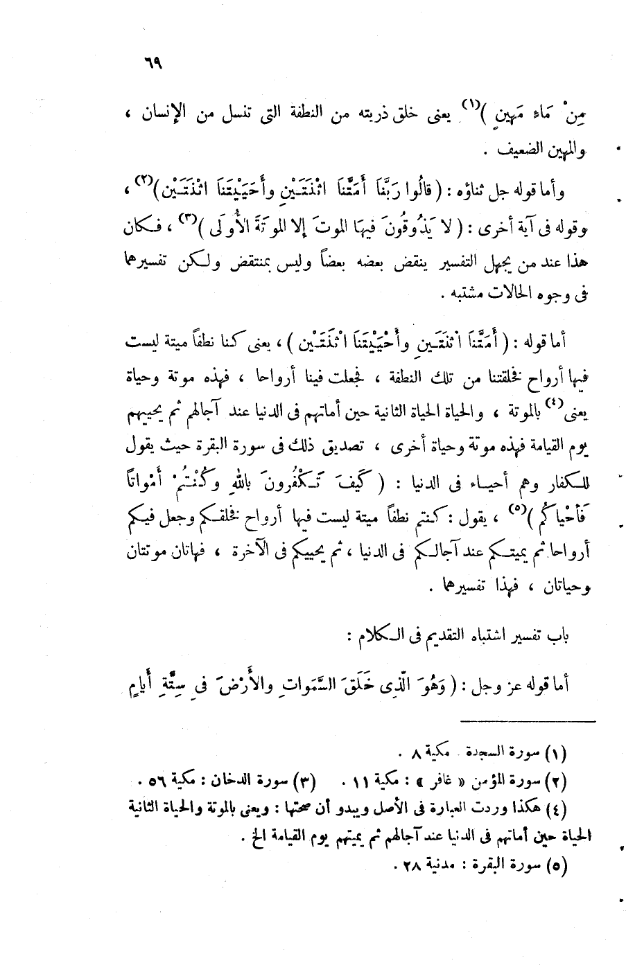 وَأما قَوْله جلّ ثَنَاؤُهُ {قَالُوا رَبنَا أمتنَا اثْنَتَيْنِ وأحييتنا اثْنَتَيْنِ} وَقَوله فِي آيَة أُخْرَى {لَا يذوقون فِيهَا الْمَوْت إِلَّا الموتة الأولى} فَكَانَ هَذَا عِنْد من يجهل التَّفْسِير ينْقض بعضه بَعْضًا وَلَيْسَ بمنتقض وَلَكِن تفسيرهما فِي وُجُوه الْحَالَات مشتبه