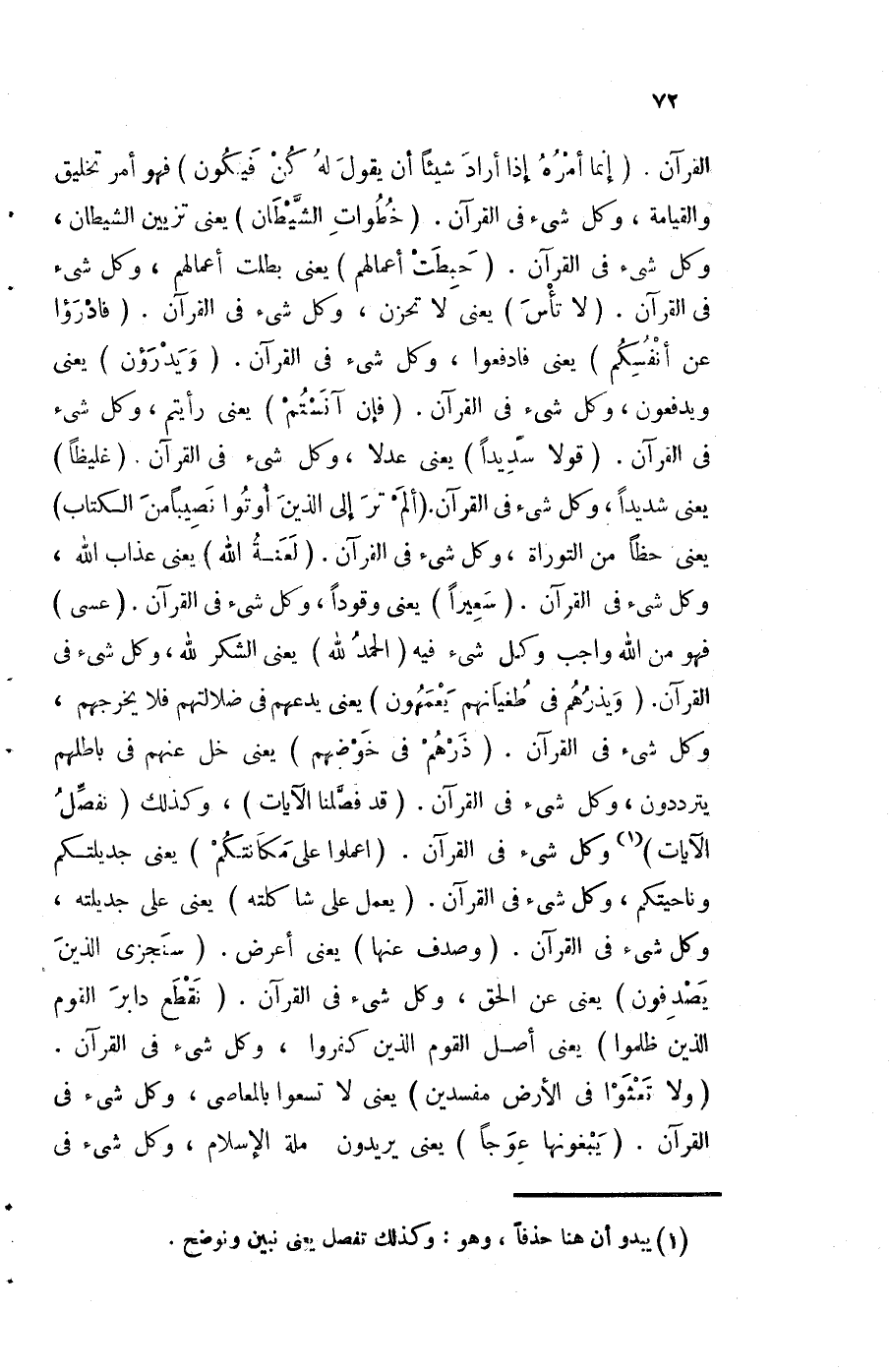 الْقُرْآن {إِنَّمَا أمره إِذا أَرَادَ شَيْئا أَن يَقُول لَهُ كن فَيكون} فَهُوَ أَمر تخليق وَالْقِيَامَة وكل شَيْء فِي الْقُرْآن {خطوَات الشَّيْطَان} يَعْنِي تَزْيِين الشَّيْطَان وكل شَيْء فِي الْقُرْآن {حبطت أَعْمَالهم} يَعْنِي بطلت أَعْمَالهم وكل شَيْء فِي الْقُرْآن {لَا تأس} يَعْنِي لَا تحزن وكل شَيْء فِي الْقُرْآن فادرؤا عَن أَنفسكُم يَعْنِي فادفعوا وكل شَيْء فِي الْقُرْآن ويدرؤن يَعْنِي ويدفعون وكل شَيْء فِي الْقُرْآن {فَإِن آنستم} يَعْنِي رَأَيْتُمْ وكل شَيْء فِي الْقُرْآن {قولا سديدا} يَعْنِي عدلا وكل شَيْء فِي الْقُرْآن {غليظا} يَعْنِي شَدِيدا وكل شَيْء فِي الْقُرْآن {ألم تَرَ إِلَى الَّذين أُوتُوا نَصِيبا من الْكتاب} يَعْنِي حظا من التَّوْرَاة وكل شَيْء فِي الْقُرْآن {لعنة الله} يَعْنِي عَذَاب الله وكل شَيْء فِي الْقُرْآن {سعيرا} يَعْنِي وقودا وكل شَيْء فِي الْقُرْآن {عَسى} فَهُوَ من الله وَاجِب وكل شَيْء فِيهِ {الْحَمد لله} يَعْنِي الشُّكْر لله وكل شَيْء فِي الْقُرْآن {ويذرهم فِي طغيانهم يعمهون} يَعْنِي يدعهم فِي ضلالتهم فَلَا يخرجهم وكل شَيْء فِي الْقُرْآن {ذرهم فِي خوضهم} يَعْنِي خل عَنْهُم فِي باطلهم يَتَرَدَّدُونَ وكل شَيْء فِي الْقُرْآن {قد فصلنا الْآيَات} وَكَذَلِكَ {نفصل الْآيَات} وكل شَيْء فِي الْقُرْآن {اعْمَلُوا على مكانتكم} يَعْنِي جديلتكم وناحيتكم وكل شَيْء فِي الْقُرْآن {يعْمل على شاكلته} يَعْنِي على جديلته وكل شَيْء فِي الْقُرْآن {وصدف عَنْهَا} يَعْنِي اعْرِض {سنجزي الَّذين يصدفون} يَعْنِي عَن الْحق وكل شَيْء فِي الْقُرْآن نقطع دابر الْقَوْم الَّذين ظلمُوا يَعْنِي أصل الْقَوْم الَّذين كفرُوا وكل شَيْء فِي الْقُرْآن {وَلَا تعثوا فِي الأَرْض مفسدين} يَعْنِي لَا تسعوا بِالْمَعَاصِي وكل شَيْء فِي الْقُرْآن {يَبْغُونَهَا عوجا} يَعْنِي يُرِيدُونَ مِلَّة الْإِسْلَام وكل شَيْء فِي