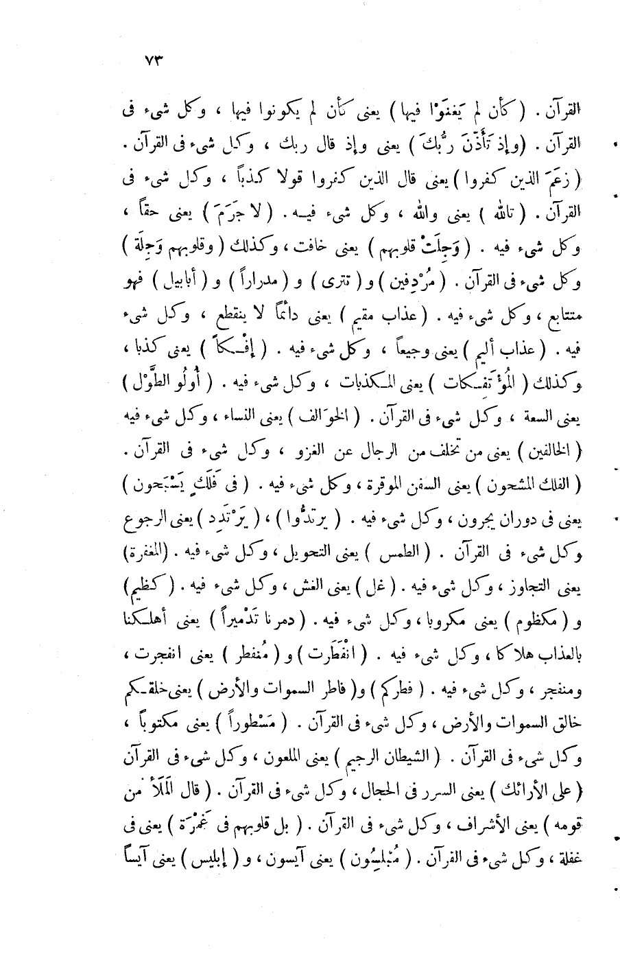 الْقُرْآن {كَأَن لم يغنوا فِيهَا} يَعْنِي كَأَن لم يَكُونُوا فِيهَا وكل شَيْء فِي الْقُرْآن {وَإِذ تَأذن رَبك} يَعْنِي وَإِذ قَالَ رَبك وكل شَيْء فِي الْقُرْآن {زعم الَّذين كفرُوا} يَعْنِي قَالَ الَّذين كفرُوا قولا كذبا وكل شَيْء فِي الْقرَان {تالله} يعْنى وَالله وكل شَيْء فِيهِ {لَا جرم} يعْنى حَقًا وكل شَيْء فِيهِ {وجلت قُلُوبهم} يعْنى خَافت وَكَذَلِكَ {وَقُلُوبهمْ وَجلة} وكل شَيْء فِي الْقرَان {مُردفِينَ} وتترى و {مدرارا} و {أبابيل} فَهُوَ متتابع وكل شَيْء فِيهِ {عَذَاب مُقيم} يعْنى دَائِما لَا يَنْقَطِع وكل شَيْء فِيهِ {عَذَاب أَلِيم} يعْنى وجيعا وكل شَيْء فِيهِ {إفكا} يعْنى كذبا وَكَذَلِكَ الْمُؤْتَفِكَات يعْنى المكذبات وكل شَيْء فِيهِ أولو الطول يعْنى السعَة وكل شَيْء فِي الْقرَان {الْخَوَالِف} يعْنى النِّسَاء وكل شَيْء فِيهِ {الخالفين} يَعْنِي من تخلف من الرِّجَال عَن الْغَزْو وكل شَيْء فِي الْقُرْآن {الْفلك المشحون} يَعْنِي السفن الموقرة وكل شَيْء فِيهِ {فِي فلك يسبحون} يَعْنِي فِي دوران يجرونَ وكل شَيْء فِيهِ يرتدوا {يرتدد} يَعْنِي الرُّجُوع وكل شَيْء فِي الْقُرْآن الطمس يَعْنِي التَّحْوِيل وكل شَيْء فِيهِ {الْمَغْفِرَة} يَعْنِي التجاوز وكل شَيْء فِيهِ {غل} يَعْنِي الْغِشّ وكل شَيْء فِيهِ {كظيم} و {مكظوم} يَعْنِي مكروبا وكل شَيْء فِيهِ دمرنا تدميرا يَعْنِي أهلكنا بِالْعَذَابِ هَلَاكًا وكل شَيْء فِيهِ {انفطرت} و {منفطر} يَعْنِي انفجرت ومنفجر وكل شَيْء فِيهِ {فطركم} و {فاطر السَّمَاوَات وَالْأَرْض} يَعْنِي خَلقكُم خَالق السَّمَوَات وَالْأَرْض وكل شَيْء فِي الْقُرْآن {مسطورا} يَعْنِي مَكْتُوبًا وكل شَيْء فِي الْقُرْآن {الشَّيْطَان الرَّجِيم} يَعْنِي الملعون وكل شَيْء فِي الْقُرْآن {على الأرائك} يَعْنِي السرر فِي الحجال وكل شَيْء فِي الْقُرْآن {قَالَ الْمَلأ من قومه} يَعْنِي الْأَشْرَاف وكل شَيْء فِي الْقُرْآن {بل قُلُوبهم فِي غمرة} يَعْنِي فِي غَفلَة وكل شَيْء فِي الْقُرْآن {مبلسون} يَعْنِي آيسون و {إِبْلِيس} يَعْنِي آيسا