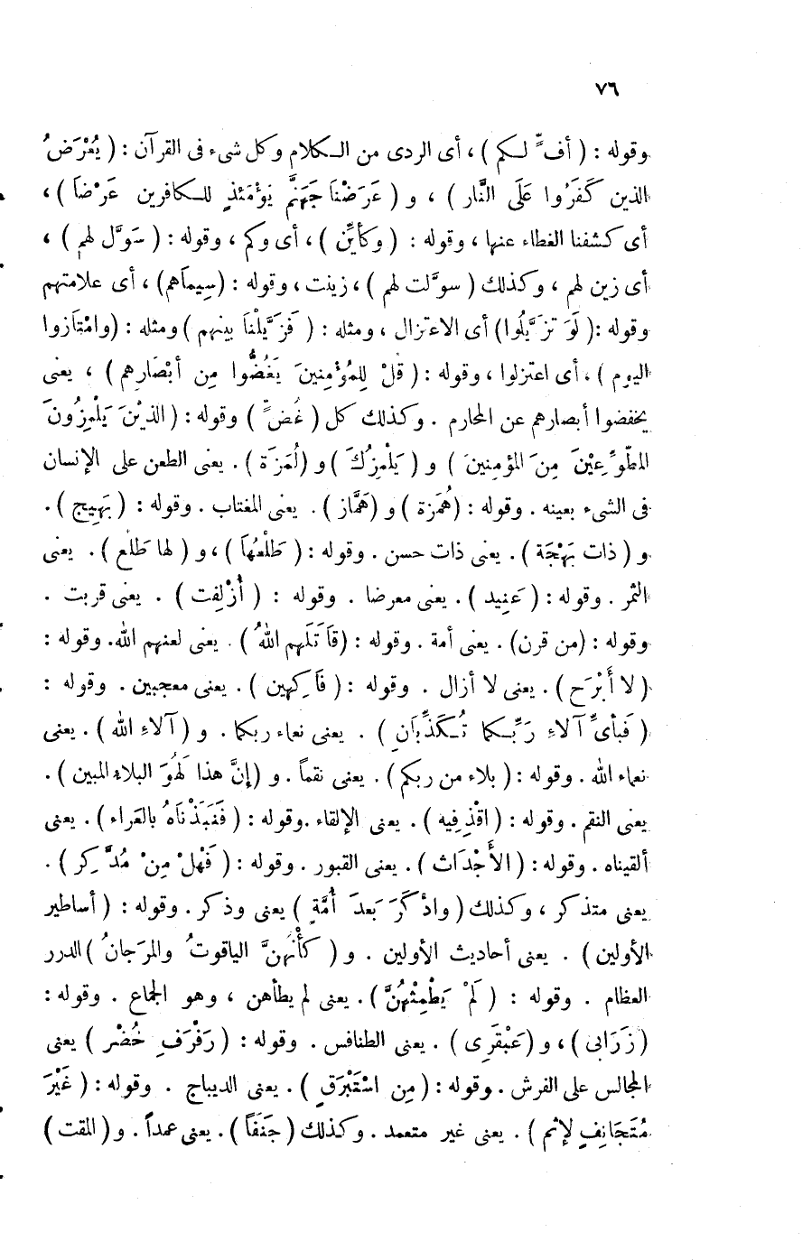 وَقَوله {أُفٍّ لكم} أَي الردى من الْكَلَام وكل شَيْء فِي الْقُرْآن {يعرض الَّذين كفرُوا على النَّار} و {عرضنَا جَهَنَّم يَوْمئِذٍ للْكَافِرِينَ عرضا} أَي كشفنا الغطاء عَنْهَا وَقَوله {وكأين} أَي وَكم وَقَوله {سَوَّلَ لَهُم} أَي زين لَهُم وَكَذَلِكَ سَوَّلت لَهُم زينت وَقَوله {سِيمَاهُمْ} أَي علامتهم وَقَوله {لَو تزيلوا} أَي الاعتزال وَمثله {فزيلنا بَينهم} وَمثله {وامتازوا الْيَوْم} أَي اعتزلوا وَقَوله {قل للْمُؤْمِنين يغضوا من أَبْصَارهم} يعْنى يخفضوا أَبْصَارهم عَن الْمَحَارِم وَكَذَلِكَ كل {غض} وَقَوله {الَّذين يَلْمِزُونَ الْمُطوِّعين من الْمُؤمنِينَ} و {يَلْمِزك} و {لُمزَة} يعْنى الطعْن على الْإِنْسَان فِي الشَّيْء بِعَيْنِه وَقَوله {همزَة} و {هماز} يعْنى المغتاب وَقَوله {بهيج} و {ذَات بهجة} يعْنى ذَات حسن وَقَوله {طلعها} و {لَهَا طلع} يعْنى الثَّمر وَقَوله {عنيد} يعْنى معرضًا وَقَوله {أزلفت} يعْنى قربت وَقَوله {من قرن} يعْنى أمة وَقَوله {قَاتلهم الله} يعْنى لعنهم الله وَقَوله {لَا أَبْرَح} يعْنى لَا أَزَال وَقَوله {فاكهين} يعْنى معجبين وَقَوله {فَبِأَي آلَاء رَبكُمَا تُكَذِّبَانِ} يعْنى نعماء رَبكُمَا و {آلَاء الله} يعْنى نعماء الله وَقَوله {بلَاء من ربكُم} يعْنى نقما و {إِن هَذَا لَهو الْبلَاء الْمُبين} يعْنى النقم وَقَوله {اقذفيه} يعْنى الْإِلْقَاء وَقَوله {فنبذناه بالعراء} يعْنى ألقيناه وَقَوله {الأجداث} يعْنى الْقُبُور وَقَوله {فَهَل من مدكر} يعْنى متذكر وَكَذَلِكَ {وادكر بعد أمة} يعْنى وَذكر وَقَوله {أساطير الْأَوَّلين} يعْنى أَحَادِيث الْأَوَّلين و {كأنهن الْيَاقُوت والمرجان} الدُّرَر الْعِظَام وَقَوله {لم يطمثهن} يعْنى لم يطأهن وَهُوَ الْجِمَاع وَقَوله {زرابي} و {عبقري} يعْنى الطنافس وَقَوله {رَفْرَف خضر} يعْنى الْمجَالِس على الْفرش وَقَوله {من إستبرق} يعْنى الديباج وَقَوله {غير متجانف لإثم} يعْنى غير متعمد وَكَذَلِكَ {جنفا} يعْنى عمدا و (المقت)