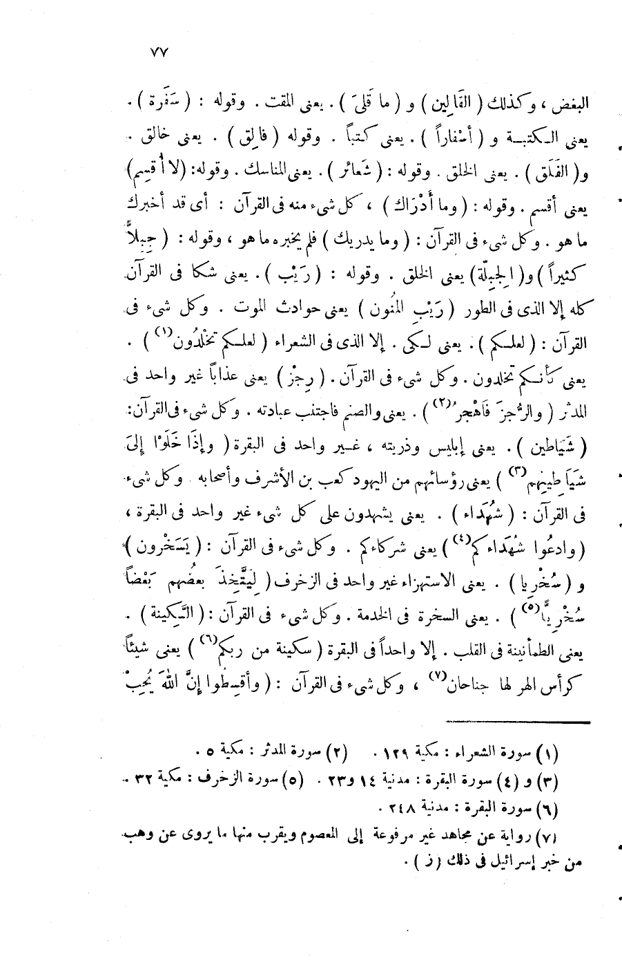 البغض وَكَذَلِكَ الفالين و {مَا قلي} يعْنى المقت وَقَوله {سفرة} يعْنى الكتبة و {أسفارا} يعْنى كتبا وَقَوله {فالق} يعْنى خَالق و {الفلق} يعْنى الْخلق وَقَوله {شَعَائِر} يعْنى الْمَنَاسِك وَقَوله {لَا أقسم} يعْنى أقسم وَقَوله {وَمَا أَدْرَاك} كل شَيْء مِنْهُ فِي الْقُرْآن أَي قد أخْبرك مَا هُوَ وكل شَيْء فِي الْقُرْآن {وَمَا يدْريك} فَلم يُخبرهُ مَا هُوَ وَقَوله {جبلا كثيرا} و {الجبلة} يعْنى الْخلق وَقَوله {ريب} يعْنى شكا فِي الْقُرْآن كُله إِلَّا الَّذِي فِي الطّور {ريب الْمنون} يعْنى حوادث الْمَوْت وكل شَيْء فِي الْقُرْآن {لَعَلَّكُمْ} يعْنى لكَي إِلَّا الَّذِي فِي الشُّعَرَاء {لَعَلَّكُمْ تخلدون} يعْنى كأنكم تخلدون وكل شَيْء فِي الْقُرْآن {رجز} يعْنى عذَابا غير وَاحِد فِي المدثر {وَالرجز فاهجر} يعْنى والصنم فاجتنب عِبَادَته وكل شَيْء فِي الْقُرْآن {شياطين} يعْنى إِبْلِيس وَذريته غير وَاحِد فِي الْبَقَرَة {وَإِذا خلوا إِلَى شياطينهم} يعْنى رُؤَسَائِهِمْ من الْيَهُود كَعْب بن الْأَشْرَف وَأَصْحَابه وكل شَيْء فِي الْقُرْآن {شُهَدَاء} يعْنى يشْهدُونَ على كل شَيْء غير وَاحِد فِي الْبَقَرَة {وَادعوا شهداءكم} يعْنى شركاءكم وكل شَيْء فِي الْقُرْآن {يسخرون} و {سخريا} يعْنى الِاسْتِهْزَاء غير وَاحِد فِي الزخرف {ليتَّخذ بَعضهم بَعْضًا سخريا} يعْنى السخرة فِي الْخدمَة وكل شَيْء فِي الْقُرْآن {السكينَة} يعْنى الطُّمَأْنِينَة فِي الْقلب إِلَّا وَاحِدًا فِي الْبَقَرَة {سكينَة من ربكُم} يعْنى شَيْئا كرأس الهر لَهَا جَنَاحَانِ وكل شَيْء فِي الْقُرْآن واقسطوا إِن الله يحب