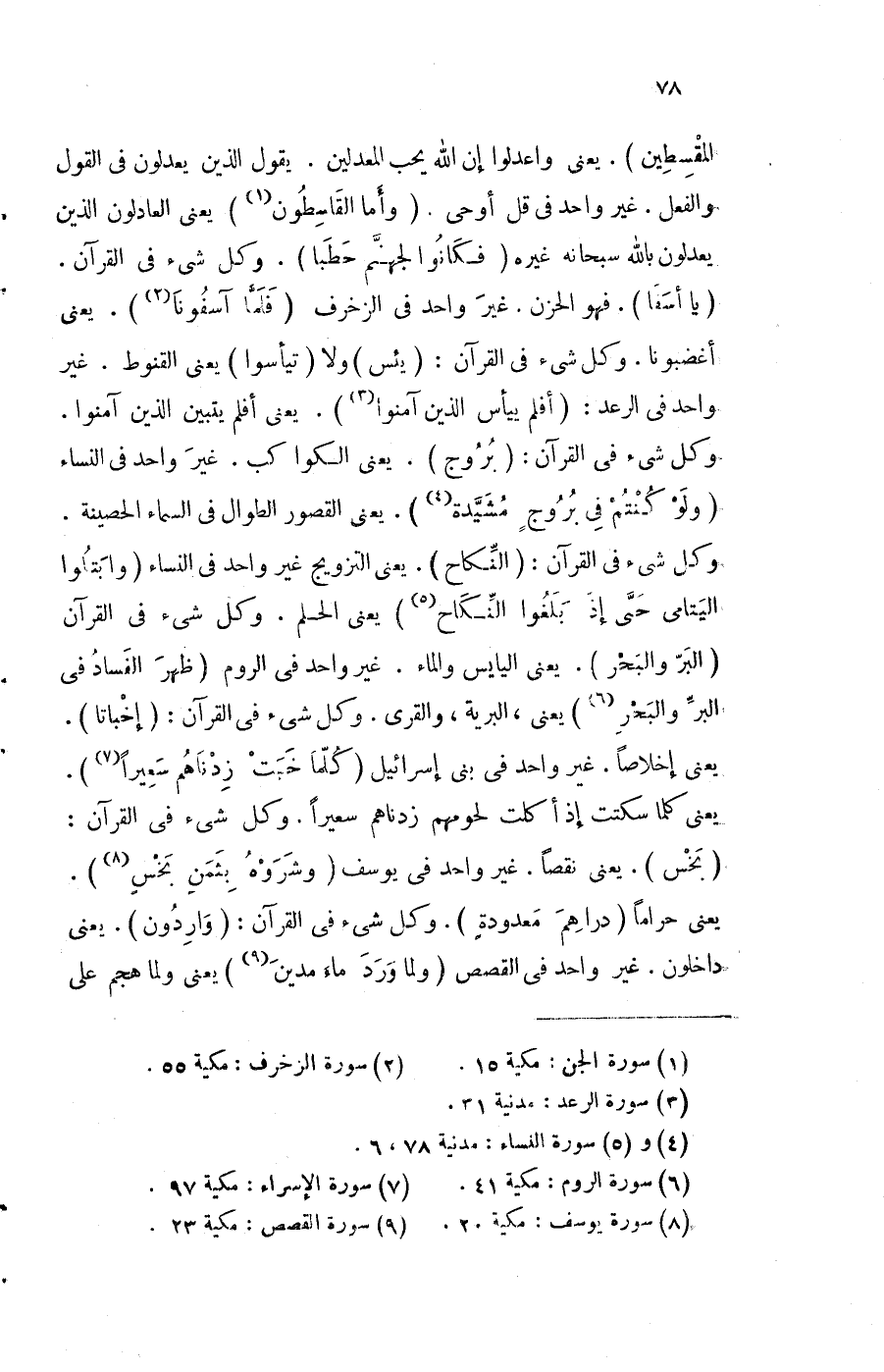 المقسطين) يعْنى واعدلوا إِن الله يحب المعدلين يَقُول الَّذين يعدلُونَ فِي القَوْل وَالْفِعْل غير وَاحِد فِي قل أوحى {وَأما القاسطون} يعْنى الْعَادِلُونَ الَّذين يعدلُونَ بِاللَّه سُبْحَانَهُ غَيره {فَكَانُوا لِجَهَنَّم حطبا} وكل شَيْء فِي الْقُرْآن يَا أسفا فَهُوَ الْحزن غير وَاحِد فِي الزخرف {فَلَمَّا آسفونا} يعْنى أغضبونا وكل شَيْء فِي الْقُرْآن {يئس} وَلَا {تيأسوا} يعْنى الْقنُوط غير وَاحِد فِي الرَّعْد أفلم ييأس الَّذين آمنُوا يعْنى أفلم يتَبَيَّن الَّذين آمنُوا وكل شَيْء فِي الْقُرْآن {بروج} يعْنى الْكَوَاكِب غير وَاحِد فِي النِّسَاء {وَلَو كُنْتُم فِي بروج مشيدة} يعْنى الْقُصُور الطوَال فِي السَّمَاء الحصينة وكل شَيْء فِي الْقُرْآن {النِّكَاح} يعْنى التَّزْوِيج غير وَاحِد فِي النِّسَاء {وابتلوا الْيَتَامَى حَتَّى إِذا بلغُوا النِّكَاح} يعْنى الْحلم وكل شَيْء فِي الْقُرْآن {الْبر وَالْبَحْر} يعْنى الْيَابِس وَالْمَاء غير وَاحِد فِي الرّوم {ظهر الْفساد فِي الْبر وَالْبَحْر} يعْنى الْبَريَّة والقرى وكل شَيْء فِي الْقُرْآن إخباتا يعْنى إخلاصا غير وَاحِد فِي بنى إِسْرَائِيل {كلما خبت زدناهم سعيرا} يعْنى كلما سكتت إِذْ أكلت لحومهم زدناهم سعيرا وكل شَيْء فِي الْقُرْآن {بخس} يعْنى نقصا غير وَاحِد فِي يُوسُف {وشروه بِثمن بخس} يعْنى حَرَامًا {دَرَاهِم مَعْدُودَة} وكل شَيْء فِي الْقُرْآن {وَارِدُونَ} يعْنى داخلون غير وَاحِد فِي الْقَصَص {وَلما ورد مَاء مَدين} يعْنى وَلما هجم على