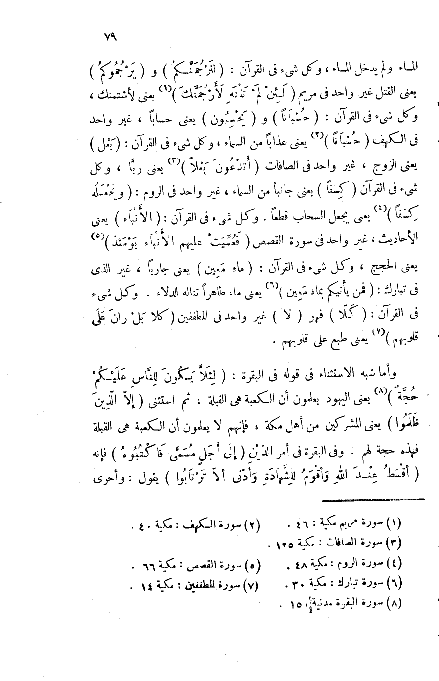 المَاء وَلم يدْخل المَاء وكل شَيْء فِي الْقُرْآن {لنرجمنكم} و {يرجموكم} يعْنى الْقَتْل غير وَاحِد فِي مَرْيَم {لَئِن لم تَنْتَهِ لأرجمنك} يعْنى لأشتمنك وكل شَيْء فِي الْقُرْآن {حسبانا} و {يحسبون} يعْنى حسابا غير وَاحِد فِي الْكَهْف {حسبانا} يعْنى عذَابا من السَّمَاء وكل شَيْء فِي الْقُرْآن {بعل} يعْنى الزَّوْج غير وَاحِد فِي الصافات {أَتَدعُونَ بعلا} يعْنى رَبًّا وكل شَيْء فِي الْقُرْآن {كسفا} يعْنى جانبا من السَّمَاء غير وَاحِد فِي الرّوم {ويجعله كسفا} يعْنى يَجْعَل السَّحَاب قطعا وكل شَيْء فِي الْقُرْآن {الأنباء} يعْنى الْأَحَادِيث غير وَاحِد فِي سُورَة الْقَصَص {فعميت عَلَيْهِم الأنباء يَوْمئِذٍ} يعْنى الْحجَج وكل شَيْء فِي الْقُرْآن {مَاء معِين} يعْنى جَارِيا غير الَّذِي فِي تبَارك {فَمن يأتيكم بِمَاء معِين} يعْنى مَاء طَاهِرا تناله الدلاء وكل شَيْء فِي الْقُرْآن {كلا} فَهُوَ {لَا} غير وَاحِد فِي المطففين {كلا بل ران على قُلُوبهم} يعْنى طبع على قُلُوبهم