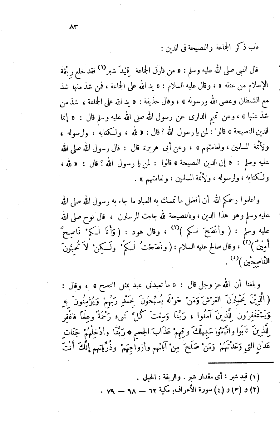 قَالَ النَّبِي صلى الله عَلَيْهِ وَسلم من فَارق الْجَمَاعَة قيد شبر فقد خلع ربقة الْإِسْلَام من عُنُقه وَقَالَ عَلَيْهِ السَّلَام يَد الله على الْجَمَاعَة فَمن شَذَّ مِنْهَا شَذَّ مَعَ الشَّيْطَان وَعصى الله وَرَسُوله وَقَالَ حُذَيْفَة يَد الله على الْجَمَاعَة شَذَّ من شَذَّ عَنْهَا وَعَن تَمِيم الدارى عَن رَسُول الله صلى الله عَلَيْهِ وَسلم قَالَ إِنَّمَا الدّين النَّصِيحَة قَالُوا لمن يَا رَسُول الله قَالَ لله ولكتابه وَلِرَسُولِهِ ولأئمة الْمُسلمين ولعامتهم وَعَن أبي هُرَيْرَة قَالَ قَالَ رَسُول الله صلى الله عَلَيْهِ وَسلم إِن الدّين النَّصِيحَة قَالُوا لمن يَا رَسُول الله قَالَ لله ولكتابه وَلِرَسُولِهِ ولأئمة الْمُسلمين ولعامتهم