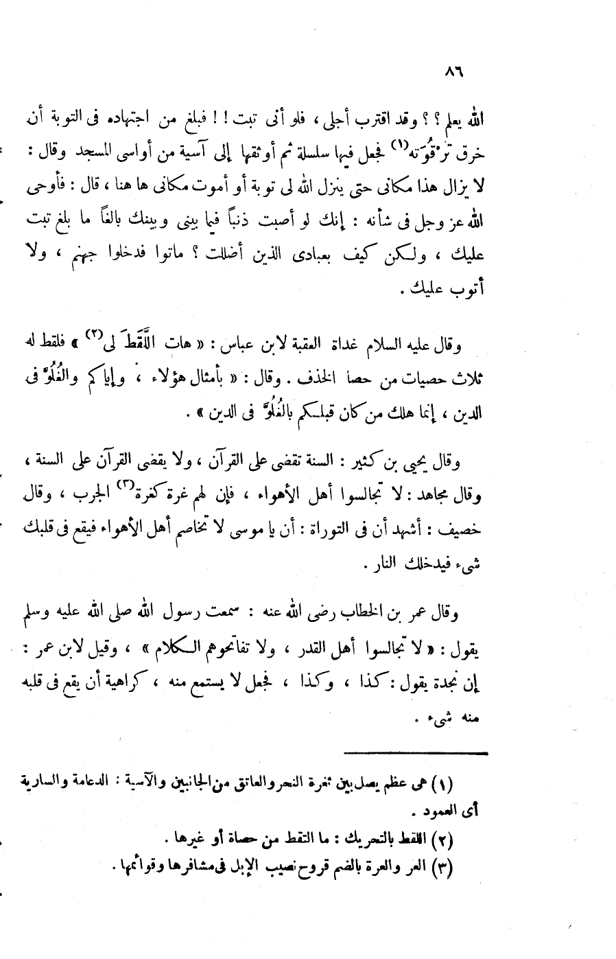 وَقَالَ عَلَيْهِ السَّلَام غَدَاة الْعقبَة لِابْنِ عَبَّاس هَات اللقط لي فلقط لَهُ ثَلَاث حَصَيَات من حصا الْخذف وَقَالَ بأمثال هَؤُلَاءِ وَإِيَّاكُم والغلو فِي الدّين إِنَّمَا هلك من كَانَ قبلكُمْ بالغلو فِي الدّين