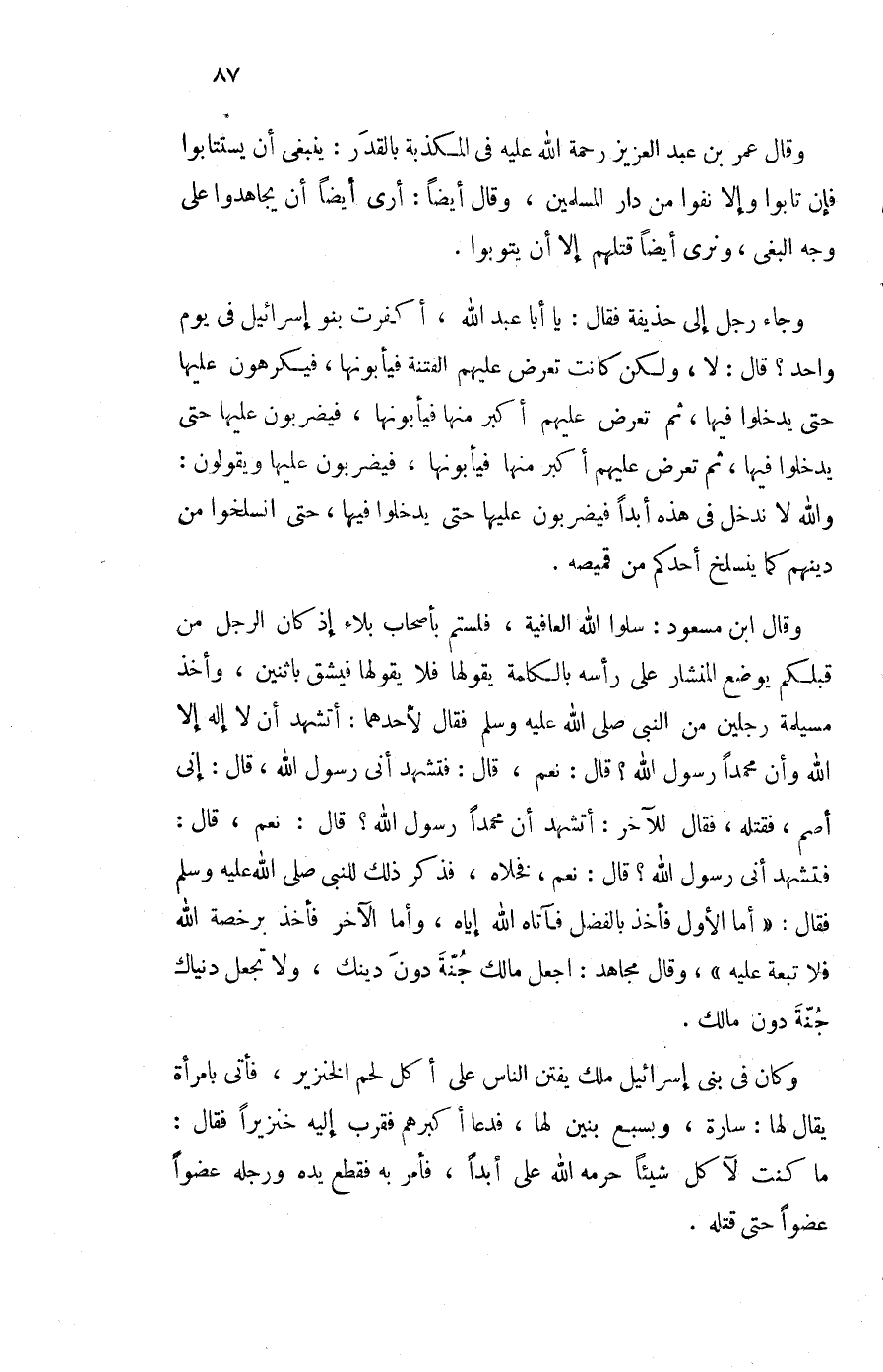 وَجَاء رجل إِلَى حُذَيْفَة فَقَالَ يَا أَبَا عبد الله أكفرت بَنو إِسْرَائِيل فِي يَوْم وَاحِد قَالَ لَا وَلَكِن كَانَت تعرض عَلَيْهِم الْفِتْنَة فيأبونها فيكرهون عَلَيْهَا حَتَّى يدخلُوا فِيهَا ثمَّ تعرض عَلَيْهِم أكبر مِنْهَا فيأبونها فيضربون عَلَيْهَا حَتَّى يدخلُوا فِيهَا ثمَّ تعرض عَلَيْهِم أكبر مِنْهَا فيأبونها فيضربون عَلَيْهَا وَيَقُولُونَ وَالله لَا ندخل فِي هَذِه أبدا فيضربون عَلَيْهَا حَتَّى يدخلُوا فِيهَا حَتَّى انسلخوا من دينهم كَمَا يَنْسَلِخ أحدكُم من قَمِيصه