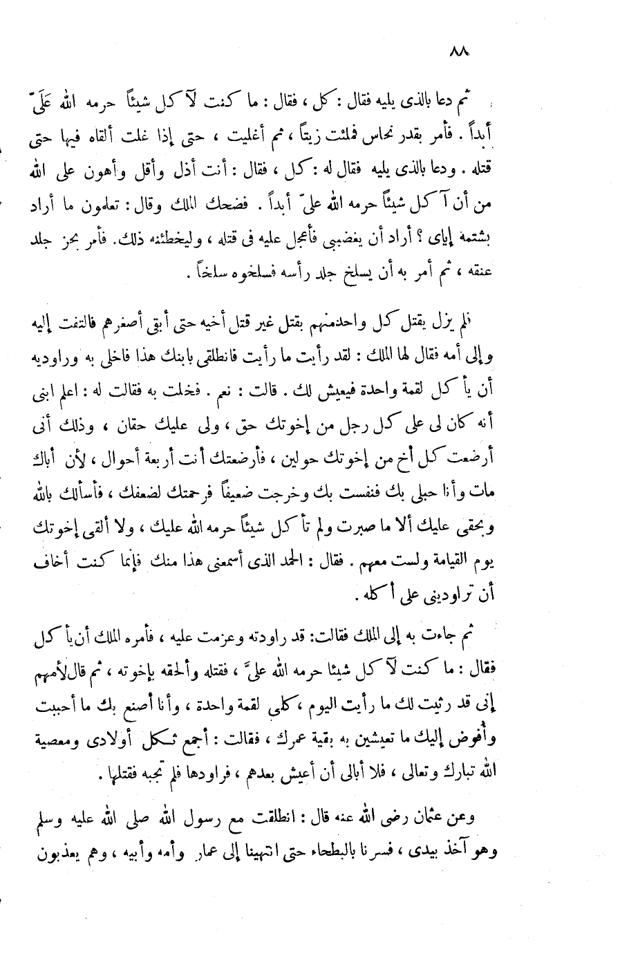 فَلم يزل يقتل كل وَاحِد مِنْهُم بقتل غير قتل أَخِيه حَتَّى أبقى أَصْغَرهم فَالْتَفت إِلَيْهِ وَإِلَى أمه فَقَالَ لَهَا الْملك لقد رَأَيْت مَا رَأَيْت فانطلقي بابنك هَذَا فاخلى بِهِ وراوديه أَن يَأْكُل لقْمَة وَاحِدَة فيعيش لَك قَالَت نعم فخلت بِهِ فَقَالَت لَهُ اعْلَم ابْني أَنه كَانَ لي على كل رجل من إخْوَتك حق ولى عَلَيْك حقان وَذَلِكَ أَنِّي أرضعت كل أَخ من إخْوَتك حَوْلَيْنِ فأرضعتك أَنْت أَرْبَعَة أَحْوَال لِأَن أَبَاك مَاتَ وَأَنا حُبْلَى بك فنفست بك وَخرجت ضَعِيفا فرحمتك لضعفك فأسألك بِاللَّه وبحقي عَلَيْك أَلا مَا صبرت وَلم تَأْكُل شَيْئا حرمه الله عَلَيْك وَلَا ألْقى إخْوَتك يَوْم الْقِيَامَة وَلست مَعَهم فَقَالَ الْحَمد الَّذِي أسمعني هَذَا مِنْك فَإِنَّمَا كنت أَخَاف أَن تراوديني على أكله