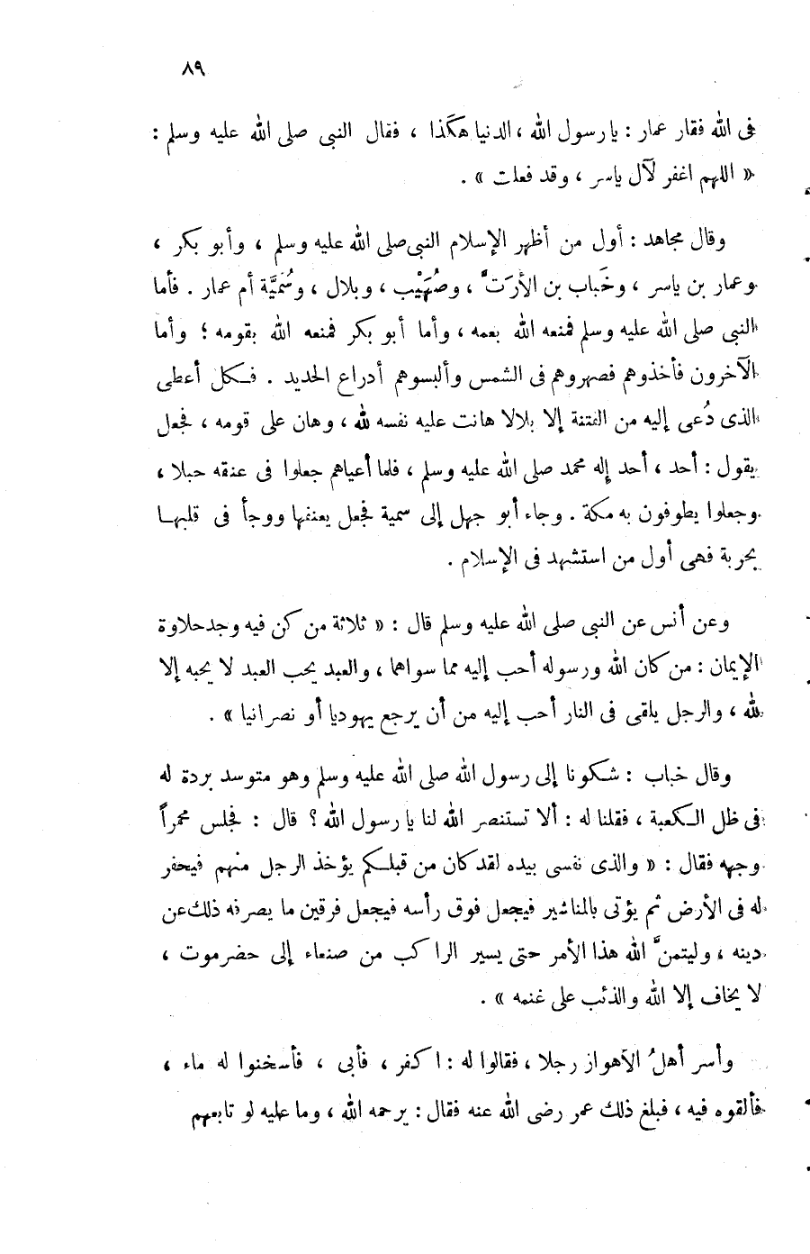 وَقَالَ مُجَاهِد أول من أظهر الْإِسْلَام النَّبِي صلى الله عَلَيْهِ وَسلم وَأَبُو بكر وعمار بن يَاسر وخباب بن الْأَرَت وصهيب وبلال وَسُميَّة أم عمار فَأَما النَّبِي صلى الله عَلَيْهِ وَسلم فَمَنعه الله بِعَمِّهِ وَأما أَبُو بكر فَمَنعه الله بقَوْمه وَأما الْآخرُونَ فَأَخَذُوهُمْ فصهروهم فِي الشَّمْس وألبسوهم أَدْرَاع الْحَدِيد فَكل أعْطى الَّذِي دعِي إِلَيْهِ من الْفِتْنَة إِلَّا بِلَالًا هَانَتْ عَلَيْهِ نَفسه لله وَهَان على قومه فَجعل يَقُول أحد أحد إِلَه مُحَمَّد صلى الله عَلَيْهِ وَسلم فَلَمَّا أعياهم جعلُوا فِي عُنُقه حبلا وَجعلُوا يطوفون بِهِ مَكَّة وَجَاء أَبُو جهل إِلَى سميَّة فَجعل يعنفها ووجأ فِي قَلبهَا بِحَرْبَة فَهِيَ أول من اسْتشْهد فِي الْإِسْلَام