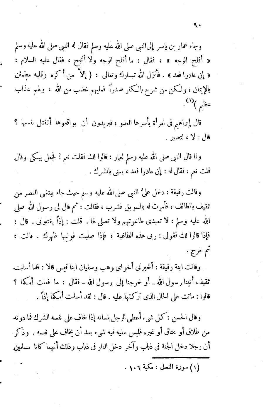 وَجَاء عمار بن يَاسر إِلَى النَّبِي صلى الله عَلَيْهِ وَسلم فَقَالَ لَهُ النَّبِي صلى الله عَلَيْهِ وَسلم أَفْلح الْوَجْه فَقَالَ مَا أَفْلح الْوَجْه وَلَا أنجح فَقَالَ عَلَيْهِ السَّلَام إِن عَادوا فعد فَأنْزل الله تبَارك وَتَعَالَى {إِلَّا من أكره وَقَلبه مطمئن بِالْإِيمَان وَلَكِن من شرح بالْكفْر صَدرا فَعَلَيْهِم غضب من الله وَلَهُم عَذَاب عَظِيم}