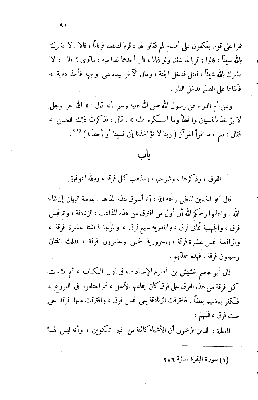 قَالَ أَبُو الْحُسَيْن الملطى رَحمَه الله أَنا اسوق هَذِه الْمذَاهب بِصِحَّة الْبَيَان إِن شَاءَ الله وَاعْلَمُوا رحمكم الله أَن أول من افترق من هَذِه الْمذَاهب الزَّنَادِقَة وهم خمس فرق والجهمية ثَمَانِي فرق والقدرية سبع فرق والمرجئة اثْنَتَا عشرَة فرقة والرافضة خمس عشرَة فرقة والحرورية خمس وَعِشْرُونَ فرقة فَذَلِك اثْنَتَانِ وَسَبْعُونَ فرقة فَهَذِهِ جُمْلَتهمْ