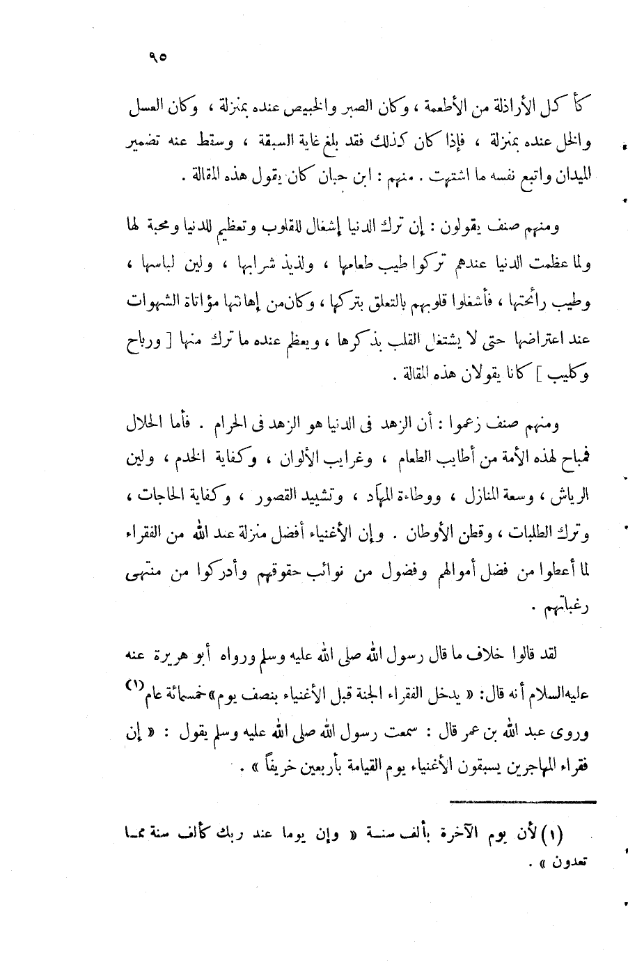 وَمِنْهُم صنف زَعَمُوا أَن الزّهْد فِي الدُّنْيَا هُوَ الزّهْد فِي الْحَرَام فَأَما الْحَلَال فمباح لهَذِهِ الْأمة من أطايب الطَّعَام وغرايب الألوان وكفاية الخدم ولين الرياش وسعة الْمنَازل ووطاءة المهاد وتشييد الْقُصُور وكفاية الْحَاجَات وَترك الطلبات وقطن الأوطان وَإِن الْأَغْنِيَاء أفضل منزلَة عِنْد الله من الْفُقَرَاء لما أعْطوا من فضل أَمْوَالهم وفضول من نَوَائِب حُقُوقهم وأدركوا من مُنْتَهى رغباتهم