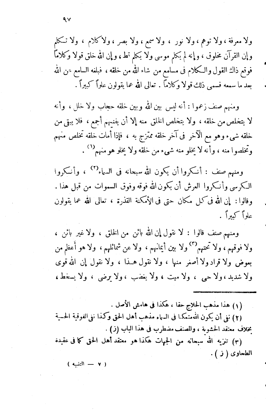 وَمِنْهُم صنف أَنْكَرُوا أَن يكون الله سُبْحَانَهُ فِي السَّمَاء وأنكروا الْكُرْسِيّ وأنكروا الْعَرْش أَن يكون الله فَوْقه وَفَوق السَّمَوَات من قبل هَذَا وَقَالُوا إِن الله فِي كل مَكَان حَتَّى فِي الْأَمْكِنَة القذرة تَعَالَى الله عَمَّا يَقُولُونَ علوا كَبِيرا