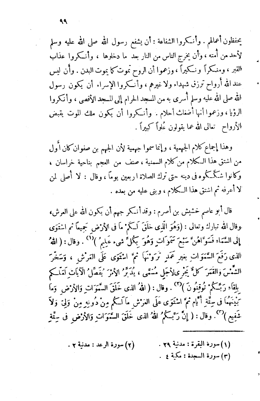 قَالَ أَبُو عَاصِم خشيش بن أَصْرَم وَقد أنكر جهم أَن يكون الله على الْعَرْش وَقَالَ الله تبَارك وَتَعَالَى وَهُوَ الَّذِي خلق لكم مَا فِي الأَرْض جَمِيعًا ثمَّ اسْتَوَى إِلَى السَّمَاء فسواهن سبع سموات وَهُوَ بِكُل شَيْء عليم وَقَالَ {الله الَّذِي رفع السَّمَاوَات بِغَيْر عمد ترونها ثمَّ اسْتَوَى على الْعَرْش وسخر الشَّمْس وَالْقَمَر كل يجْرِي لأجل مُسَمّى يدبر الْأَمر يفصل الْآيَات لَعَلَّكُمْ بلقاء ربكُم توقنون} وَقَالَ {الله الَّذِي خلق السَّمَاوَات وَالْأَرْض وَمَا بَينهمَا فِي سِتَّة أَيَّام ثمَّ اسْتَوَى على الْعَرْش مَا لكم من دونه من ولي وَلَا شَفِيع} وَقَالَ إِن ربكُم الله الَّذِي خلق السَّمَوَات وَالْأَرْض فِي سِتَّة