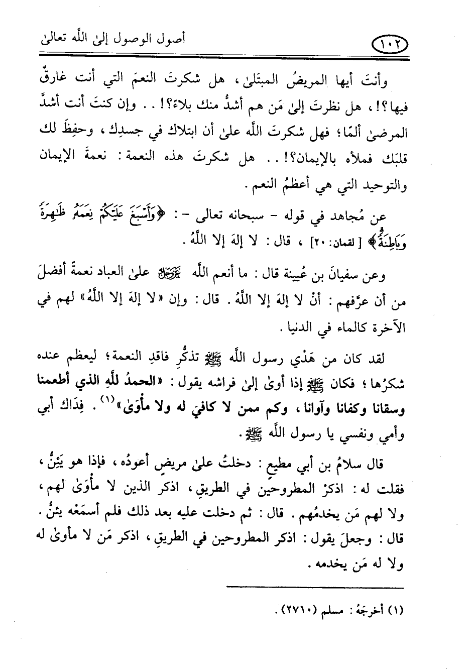 وأنت أيها المريض المبتلى هل شكرت النعم التي أنت غارق فيها؟! هل نظرت إلى من هم أشد منك بلاء؟! .. وان كنت أنت أشد المرضى ألما فهل شكرت الله على ان ابتلاك في جسدك وحفظ لك قلبك فملأه بالايمان؟! هل شكرت هذه النعمة: نعمة الايمان والتوحيد التي هى أعظم النعم.