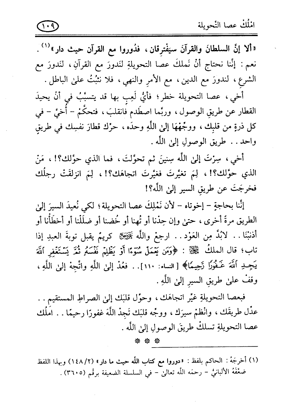 نعم: إننا نحتاج أن نملك عصا التحويلة لندور مع القرآن , لندور مع الشرع , لندور مع الدين , مع الامر والنهى , فلا نثبت على الباطل.