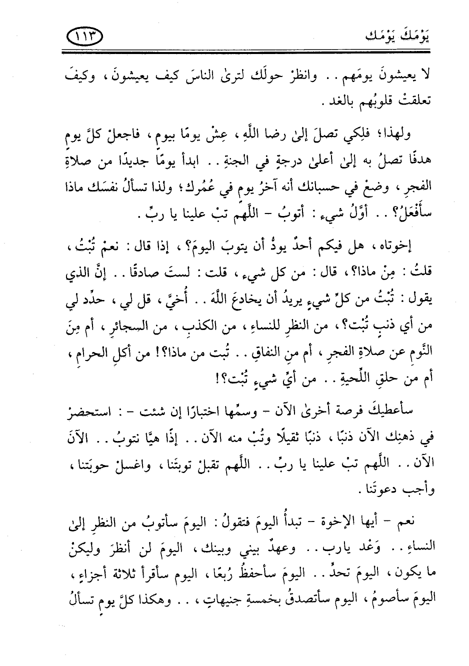 ولهذا , فلكى تصل إلى رضا الله عش يوما بيوم , فاجعل كل يوم هدفا تصل به إلى أعلى درجة في الجنة .. ابدأ يوما جديدا من صلاة الفجر , وضع في حسبانك أنه آخر يوم في عمرك , ولذا تسأل نفسك ماذا سأفعل؟ .. أول شىء: أتوب - اللهم تب علينا يا رب.