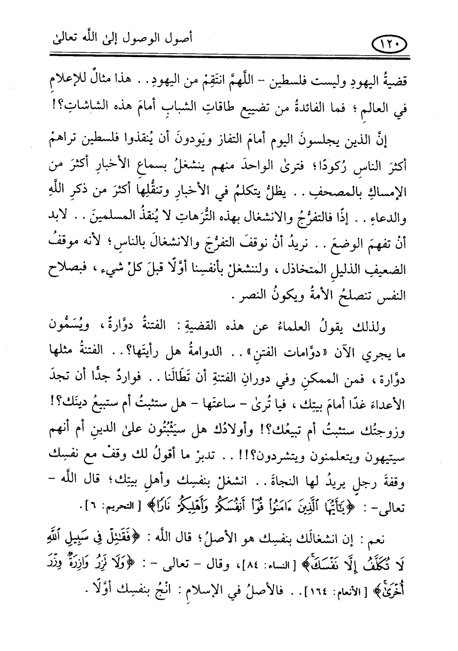إن الذين يجلسون اليوم امام التلفاز ويودون أن ينقذوا فلسطين تراهم أكثر الناس ركودا , فترى الواحد منهم ينشغل بسماع الاخبار أكثر من الامساك بالمصحف .. يظل يتكلم فى الاخبار وتنقلها أكثر من ذكر والدعاء .. إذا فالتفرج والانشغال بهذه الترهات لا ينقذ المسلمين .. لابد أن تفهم الوضع .. نريد أن نوقف التفرج والانشغال بالناس , لأنه موقف الضعيف الذليل المتخاذل , ولننشغل بأنفسنا أولا قبل كل شىء , فبصلاح النفس تنصلح الامة ويكون النصر.