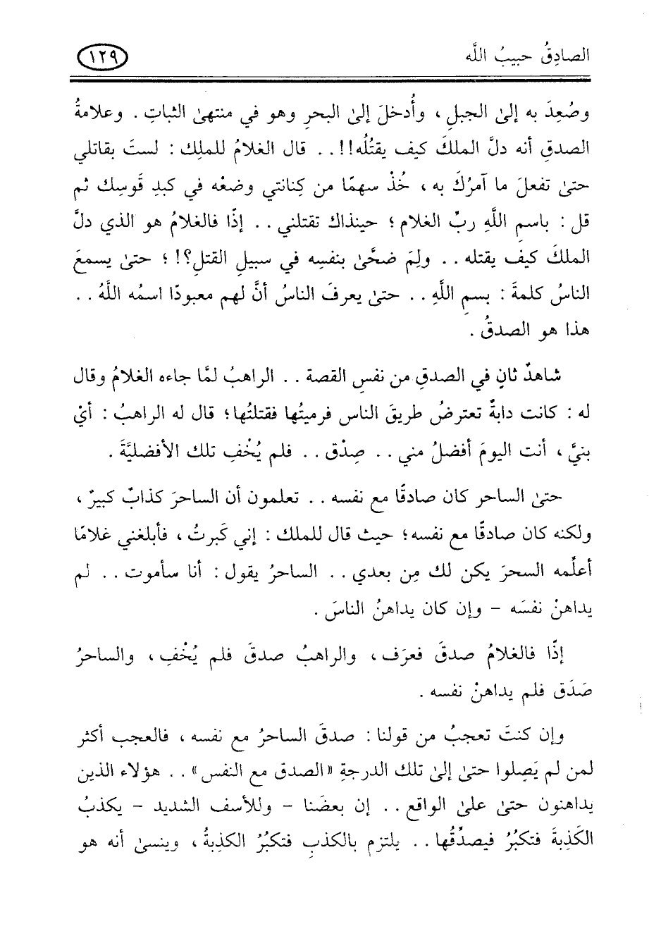شاهد ثان فى الصدق من نفس القصة .. الراهب لما جاءه الغلام وقال له: كانت دابة تعترض طريق الناس فرميتها فقتلتها , قال له الراهب: أى بنى , أنت اليوم أفضل منى .. صدق .. فلم يخف تلك الافضلية. حتى الساحر كان صادقا مع نفسه .. تعلمون أن الساحر كذاب كبير , ولكنه كان صادقا مع نفسه , حيث قال للملك: إنى كبرت , فأبلغنى غلاما أعلمه السحر يكن لك من بعدى .. الساحر يقول: أنا سأموت .. لم يداهن نفسه - وإن كان يداهن الناس.