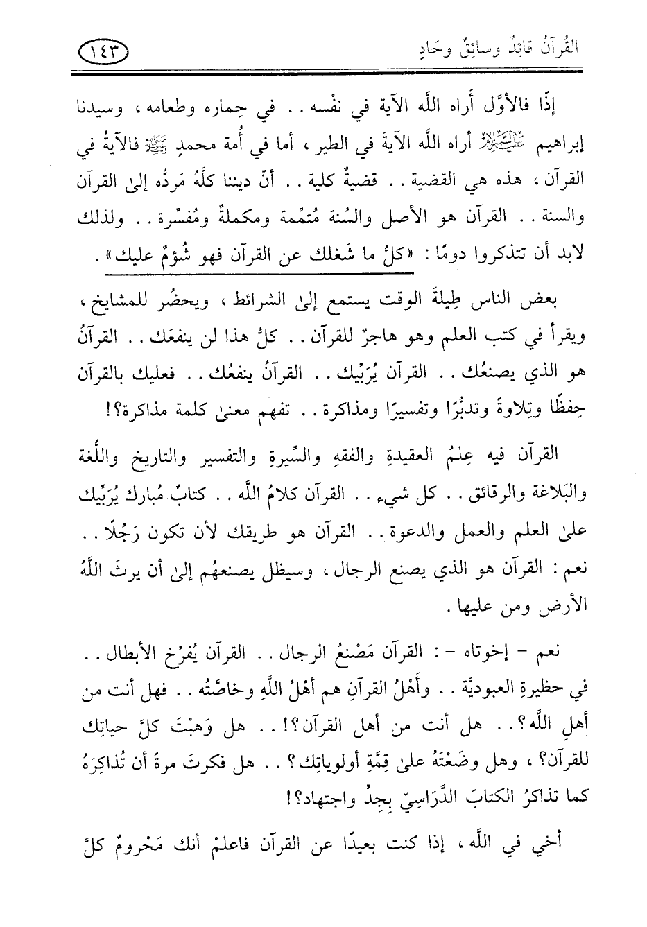 القرآن فيه علم العقيدة والفقه والسيرة والتفسير والتاريخ واللغة والبلاغة والرقائق .. كل شىء .. القرآن كلام الله .. كتاب مبارك يربيك على العلم والعمل والدعوة .. القرآن هو طريقك لأن تكون رجلا .. نعم: القرآن هو الذى يصنع الرجال , وسيظل يصنعهم إلى أن يرث الله الارض ومن عليها.