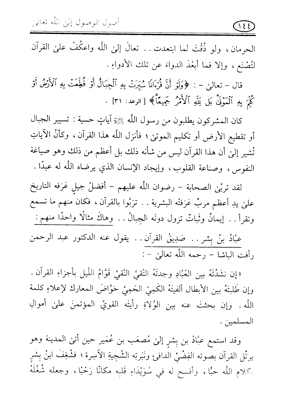 وهاك مثالا واحدا منهم: عبّاد بن بشر .. صديق القرآن .. يقول الكتور عبدالرحمن رأفت باشا - رحمه الله تعالى -: " إن نشدته بين العبّاد وجدته التقى النقى قوّام الليل بأجزاء القرآن , وإن طلبته بين الأبطال ألفيته الكمى الحمى خوّاض المعارك لإعلاء كلمة الله , وإن بحثت عنه بين الولاة رأيته القوى المؤتمن على أموال المسلمين.