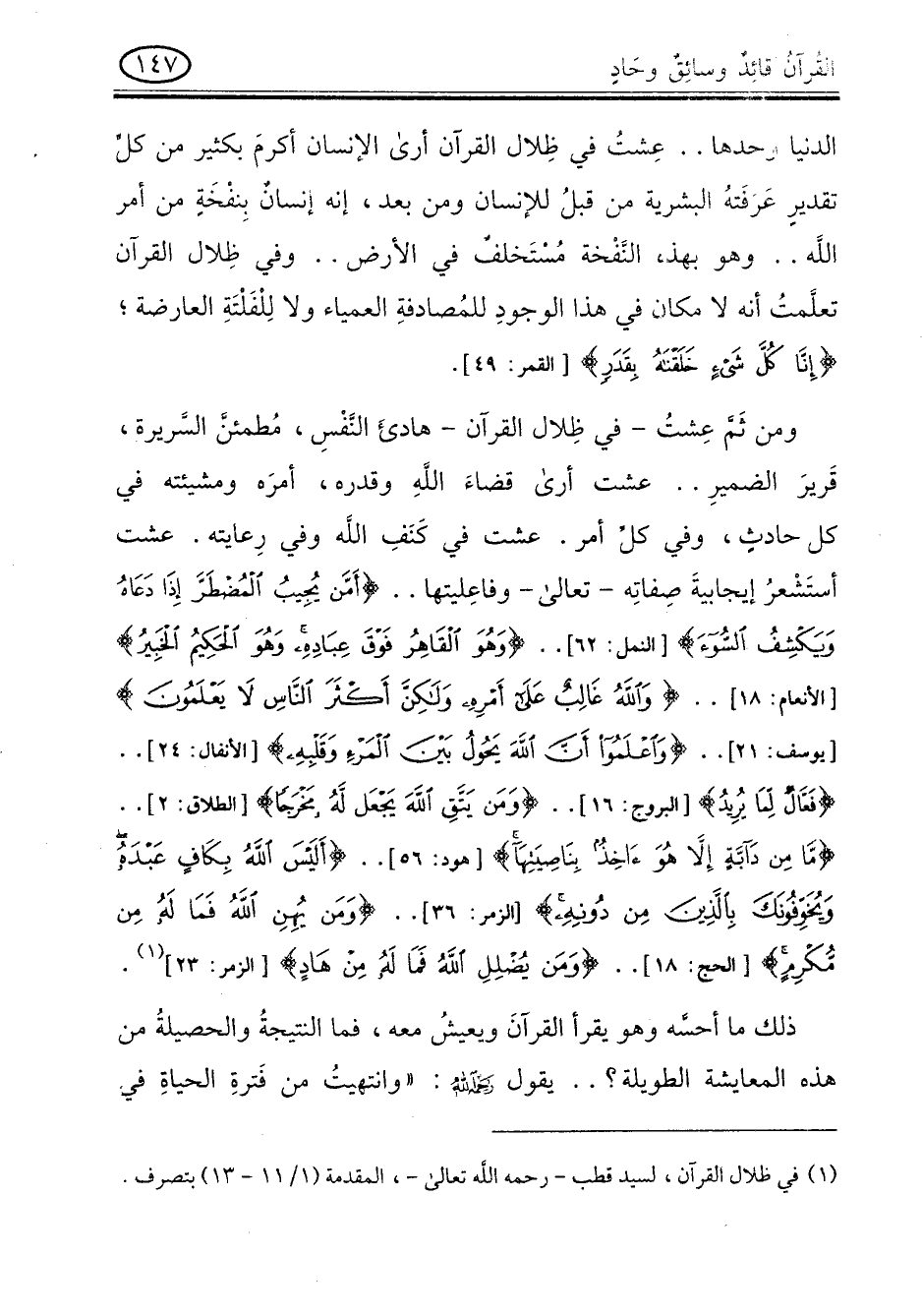 ومن ثم عشت - فى ظلال القرآن - هادىء النفس , مطمئن السريرة , قرير الضمير .. عشت أرى قضاء الله وقدره , أمره ومشيئته فى كل حادث , وفى كل أمر. عشت فى كنف الله وفى رعايته , عشت استشعر إيجابية صفاته - تعالى - وفاعليتها .. " أمن يجيب المضطر إذا دعاه ويكشف السوء " (النمل: 62) ..