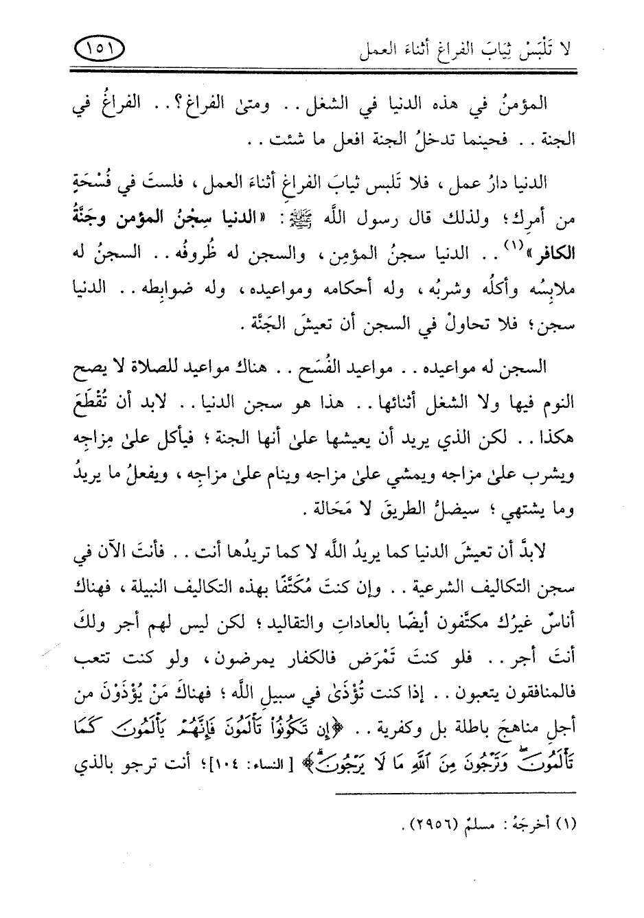 المؤمن فى هذه الدنيا فى شغل .. ومتى الفراغ؟ .. الفراغ فى الجنة .. فحينما تدخل الجنة افعل ما شئت .. الدنيا دار عمل , فلا تلبس ثياب الفراغ أثناء العمل , فلست فى فسحة من أمرك , ولذلك قال رسول الله صلى الله عليه وسلم: " الدنيا سجن المؤمن وجنة الكافر ". [أخرجه مسلم] الدنيا سجن المؤمن , والسجن له ظروفه .. السجن له ملابسه وأكله وشربه , وله أحكامه ومواعيده , وله ضوابطه .. الدنيا سجن , فلا تحاول فى السجن أن تعيش الجنة.